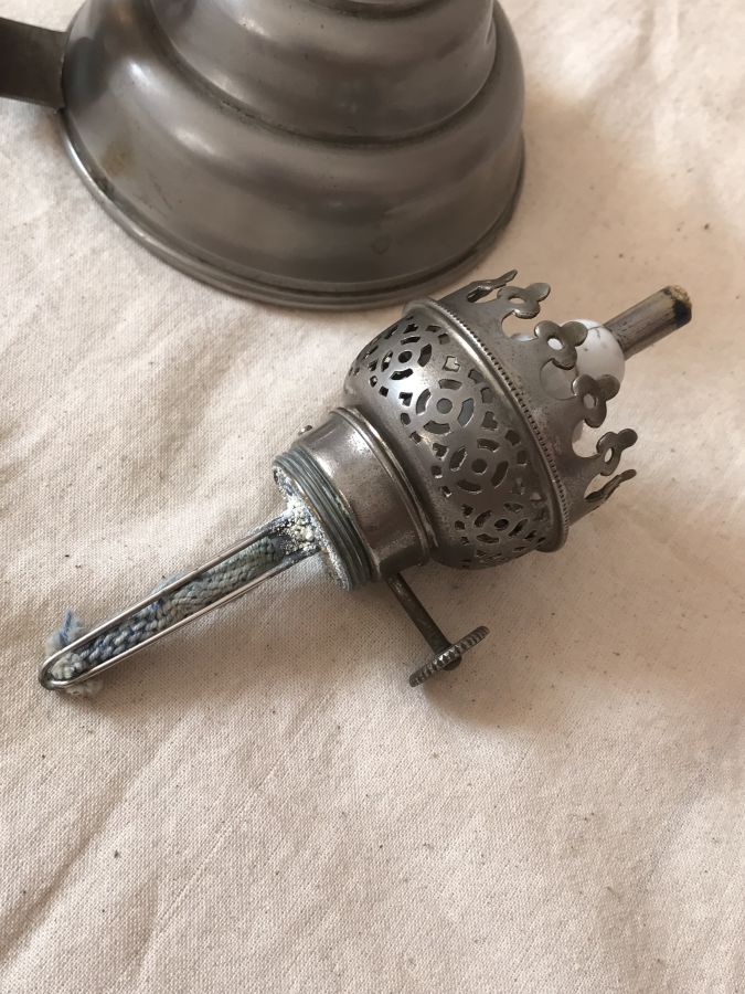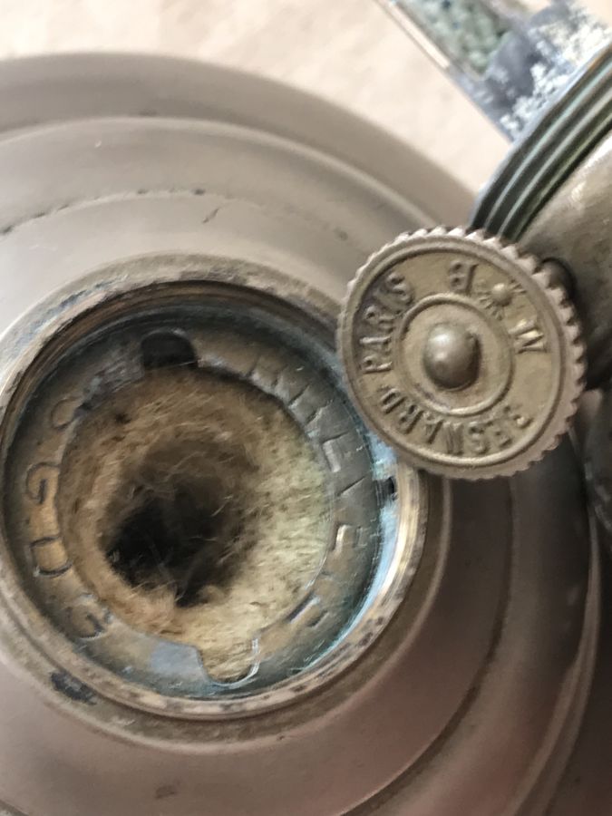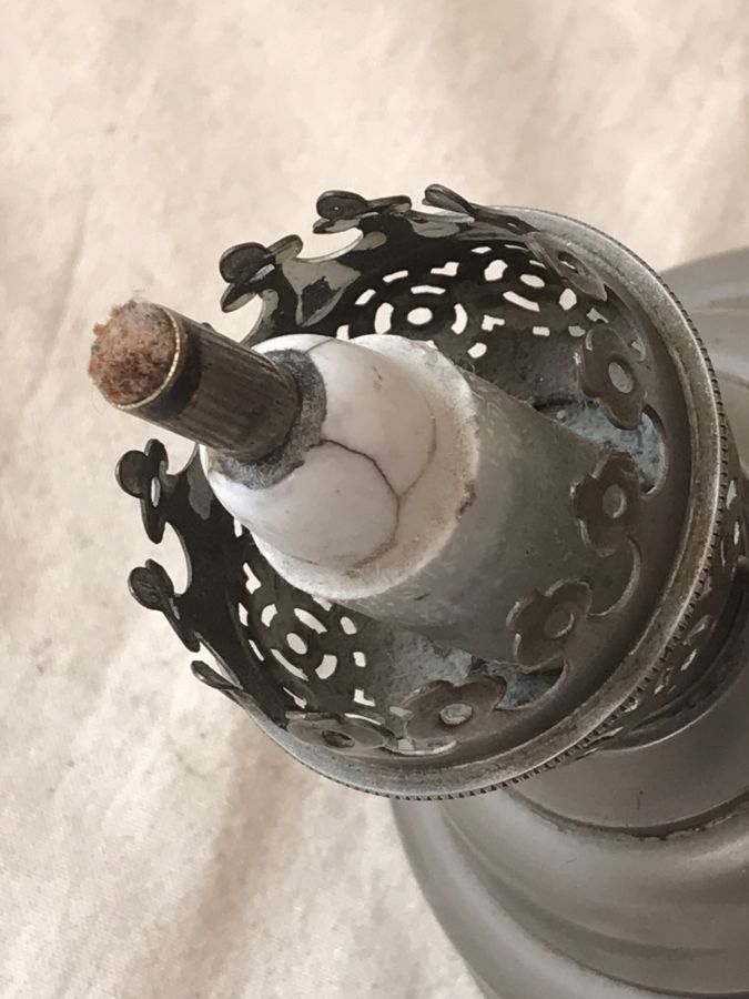 Em giao lưu đèn dầu Pháp cổ với phần đốt bấc bọc sứ rất độc đáo.