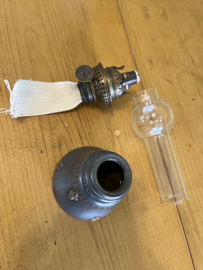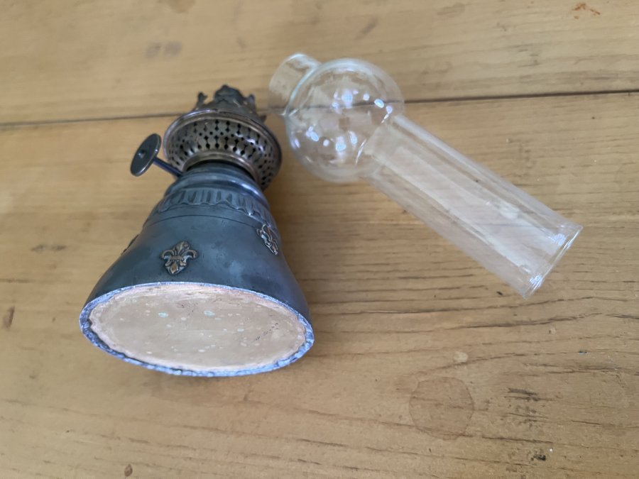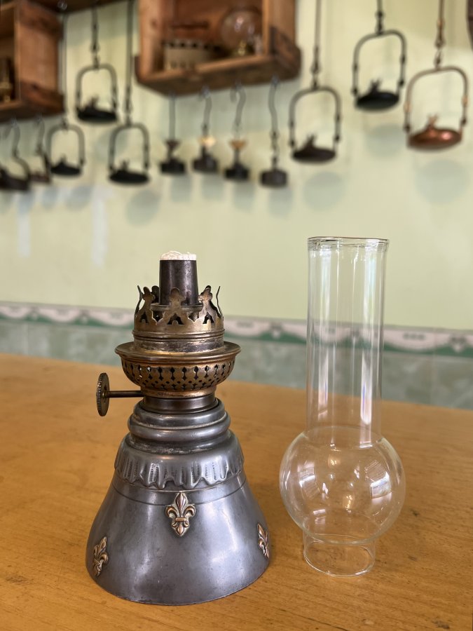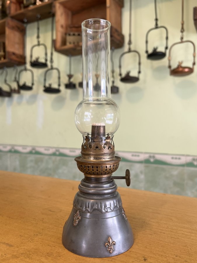 Em giao lưu đèn dầu Pháp đính hoa tiết Đồng đỏ rất đẹp. Họng đồng thau mộc chữ G, sử dụng êm ái, bấc êm ru
