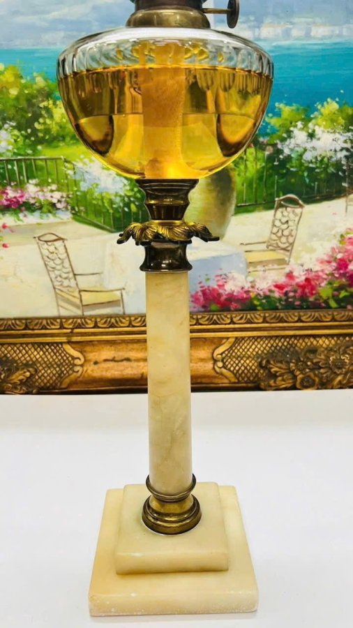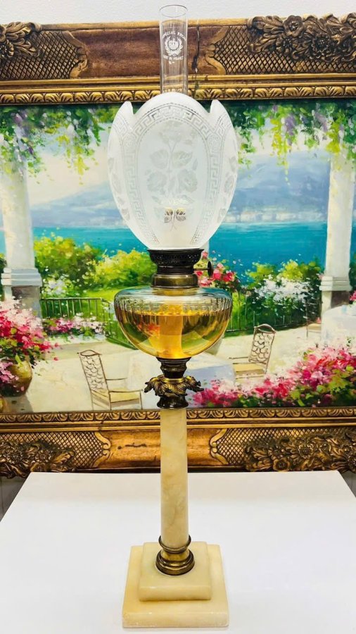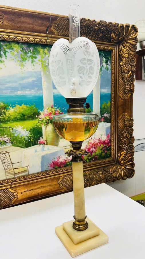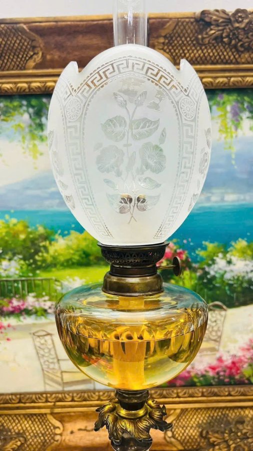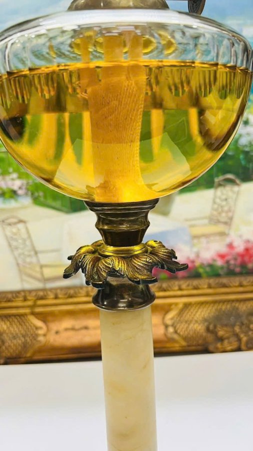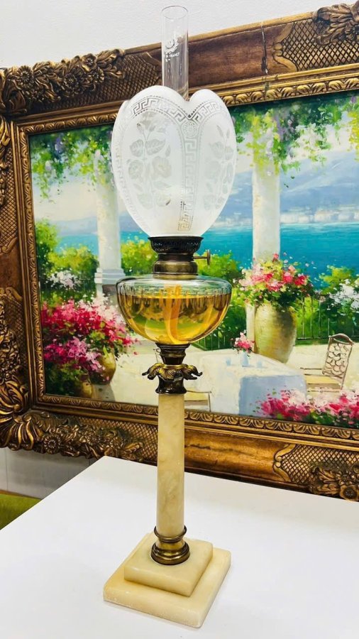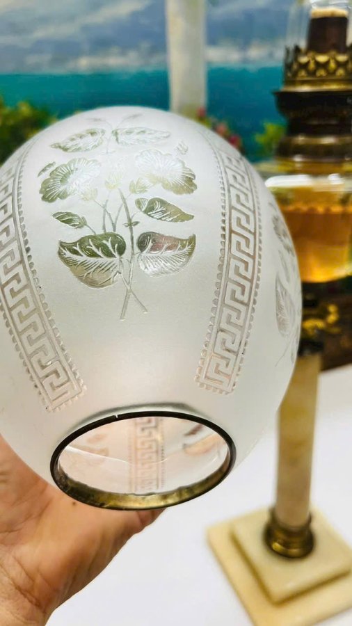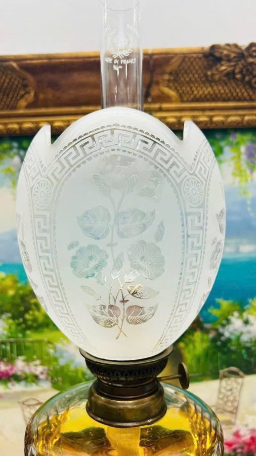 Đèn dầu Pháp chuẩn Cổ bầu pha Lê mài , lam Luis khắc hoa nổi cực kỳ sắc nét chân đồng đúc đá mỡ gà đã lên nước Zin nguyên bản sử dụng tốt