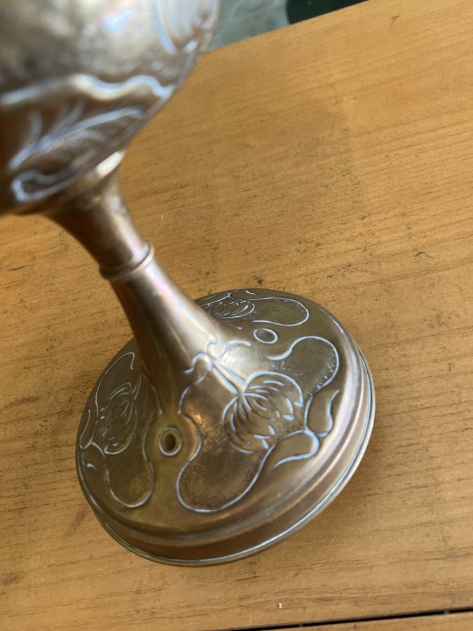 Chất đồng thau, hoa văn gò thủ công hình Búp Sen cực đẹp, đồng bộ trên Bầu và chân đèn