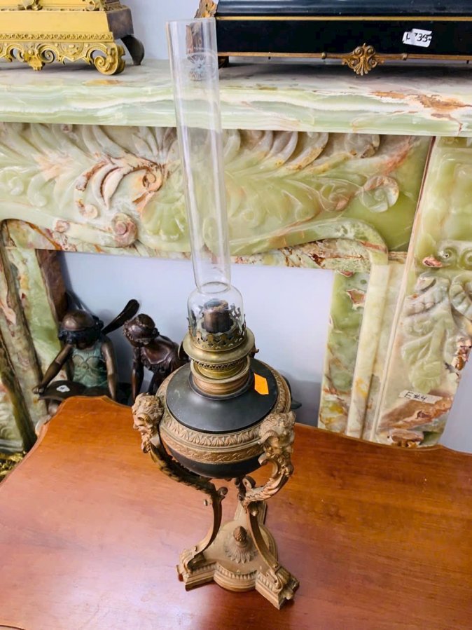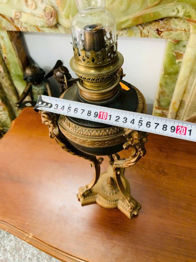 Chất liệu đồng thau patin cổ, ống khói thủy tinh nguyên bản, cao khoảng 60 cm.