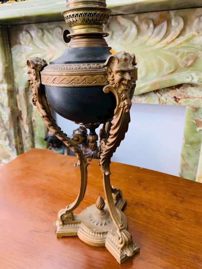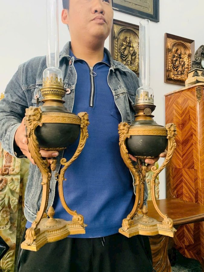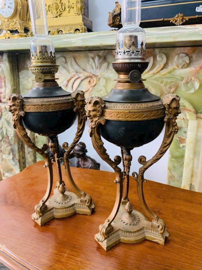 Cặp đèn dầu đồng cổ châu Âu, phong cách Louis XVI, chế tác tinh xảo với đầu sư tử – họa tiết lá acanthus đặc trưng.