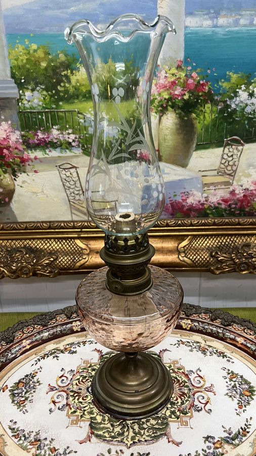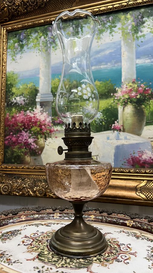 Đèn dầu Pháp cổ bầu Hồng phấn chân đồng lành đẹp sử dụng tốt