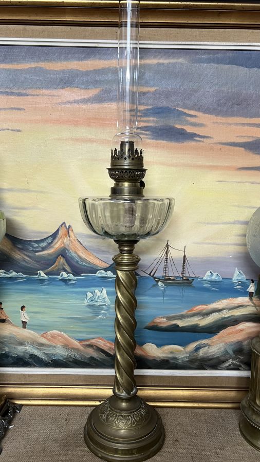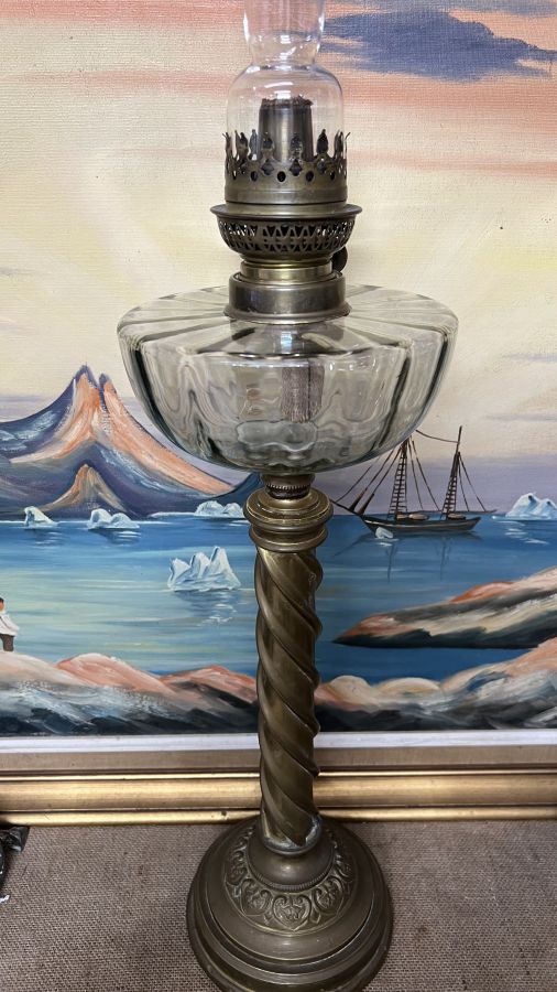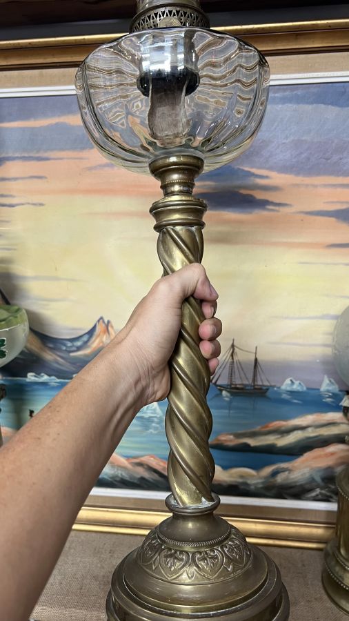 Đèn dầu Pháp cổ bầu pha Lê chân đồng to chà bá tuyệt đẹp họng bóng triện logo, sử dụng tốt
