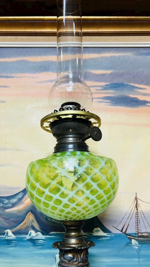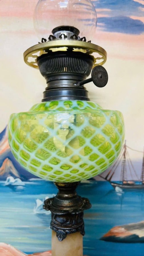 Đèn dầu Pháp cổ bầu Vasalin caro 2 da nổi rất đẹp , chân đá cẩm thạch già đã lên vân, cốt đá to 4,3cm , Zin nguyên bản