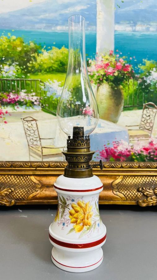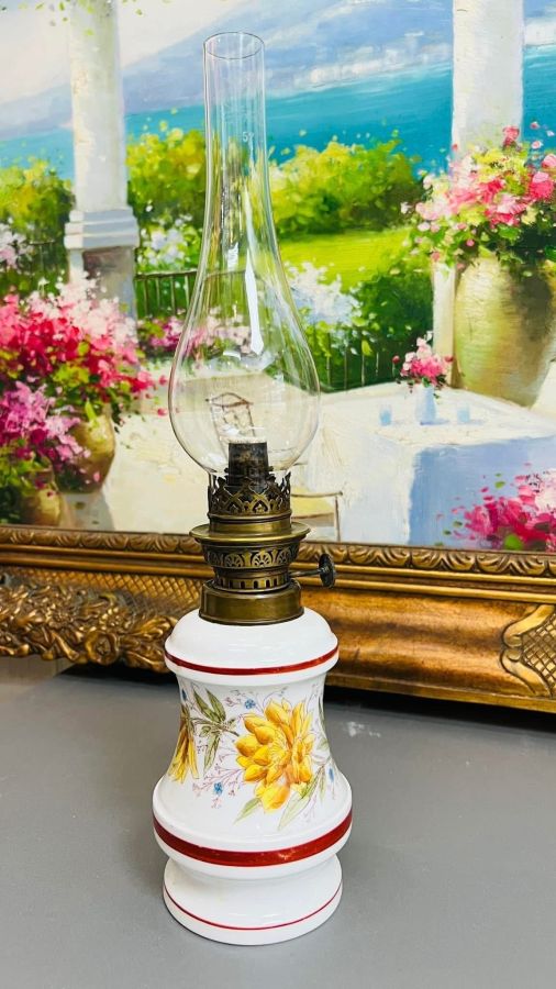 Cổ vật đèn dầu Sứ Pháp xưa, men sứ tinh tế, vẽ tay hoa hướng dương thanh nhã, bóng zin dày dặn nguyên bản – ánh sáng trầm ấm, nét đẹp vượt thời gian. Kích thước: cao 41cm, bầu 10cm, họng bóng 3,9cm.