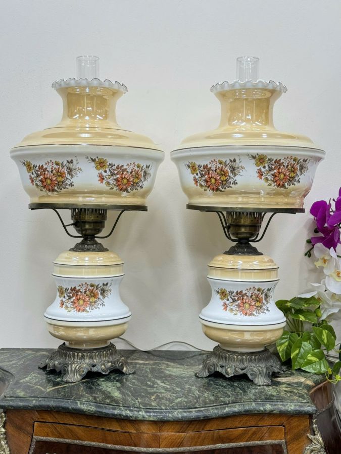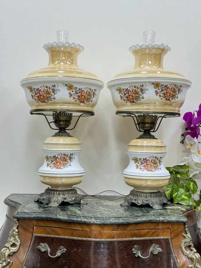 Cặp Đèn Dầu Điện Chao Sứ Bình Đồng Cổ Xưa