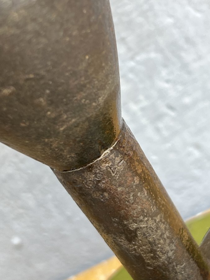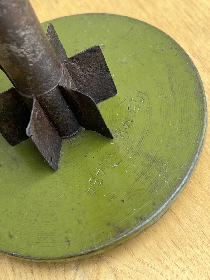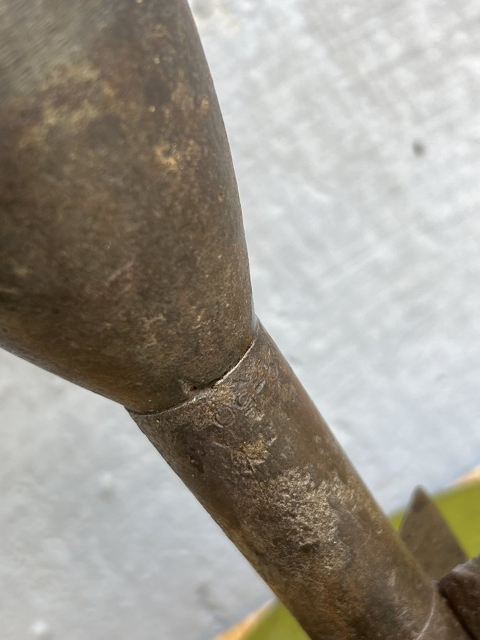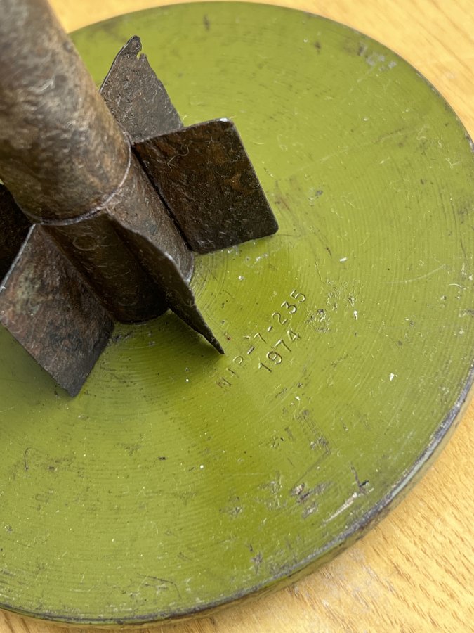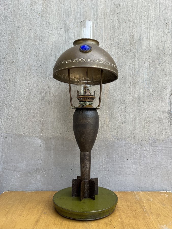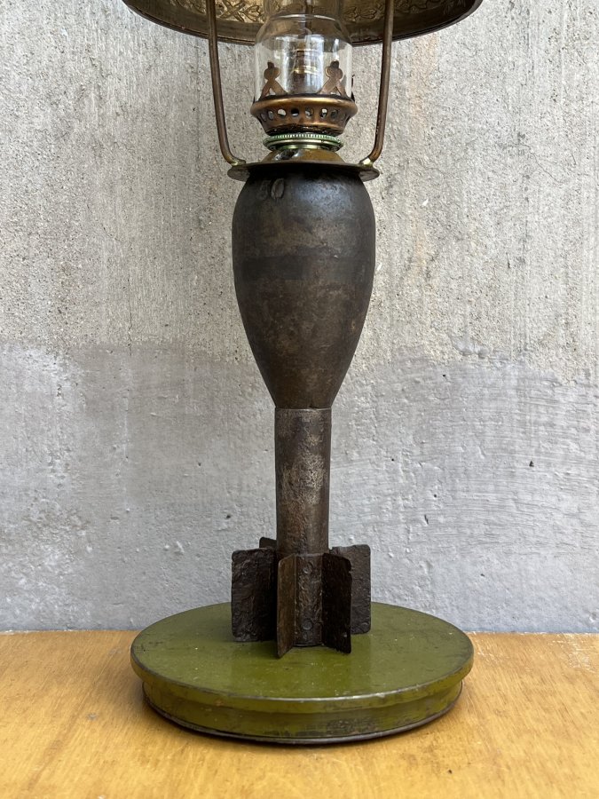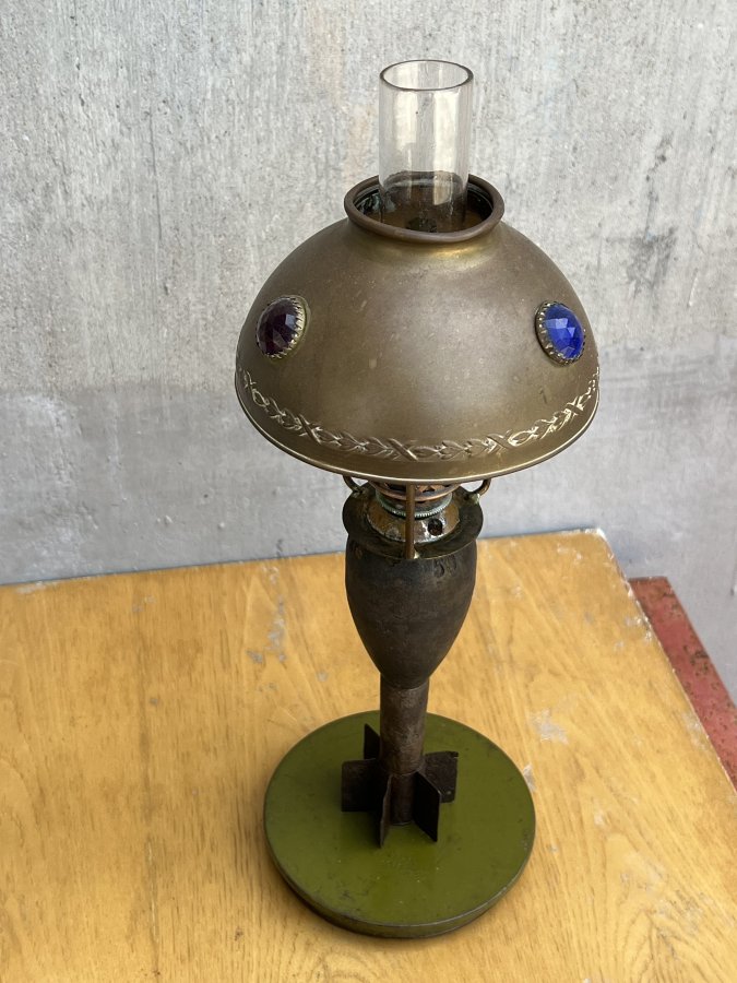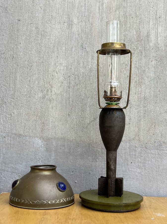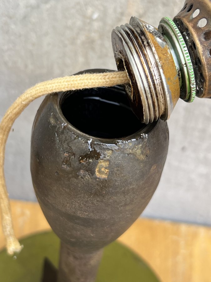 Em giao lưu đèn dầu độc lạ được chế tác từ vỏ Cối 50mm của Pháp loại Phóng lựu chân dài - zin nguyên bản còn nhiều ký tự chữ số trên thân và chân đèn