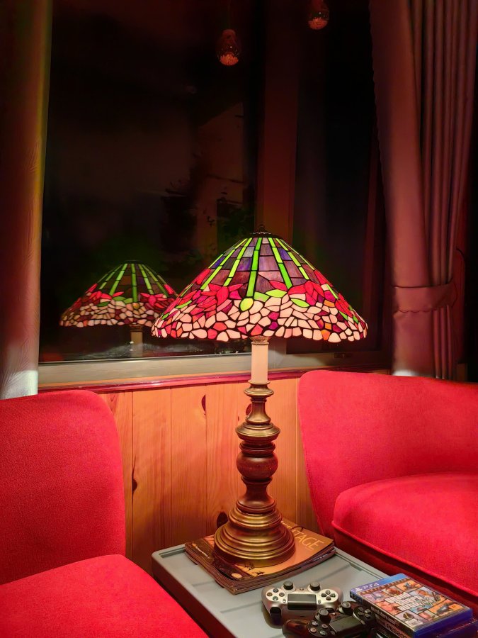 Chất liệu : Thân bằng gỗ + kim loại Chóa tiffany kính