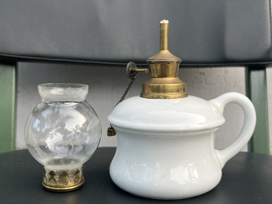 Em giao lưu đèn dầu Pháp cổ bầu gốm sứ họng đồng thau mộc chữ rõ nét, thiết kế quai cầm kute thuận tiện sử dụng, để bàn hoặc cầm di chuyển đều hợp lý.