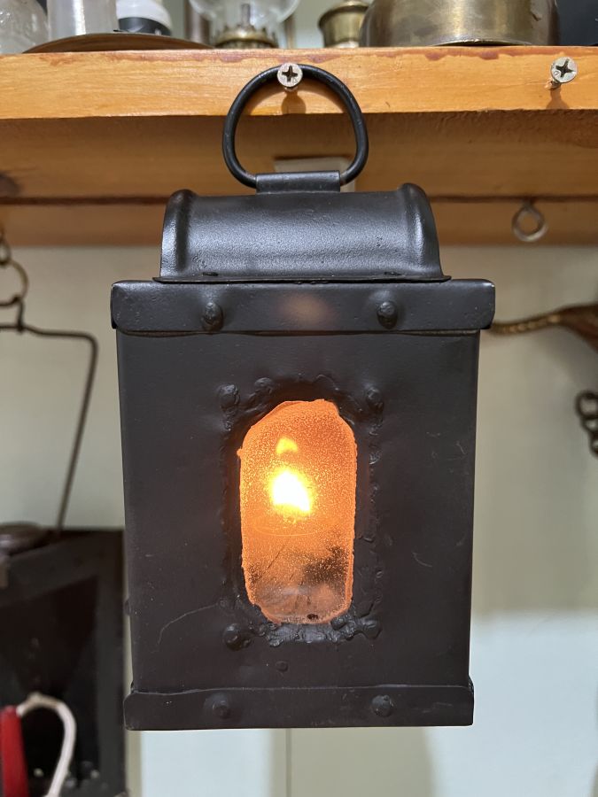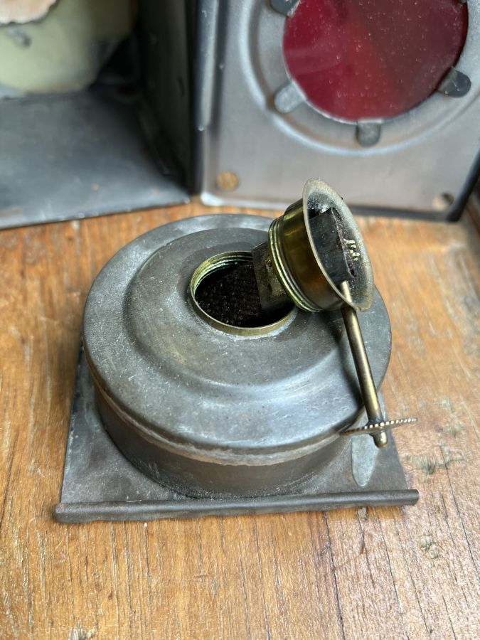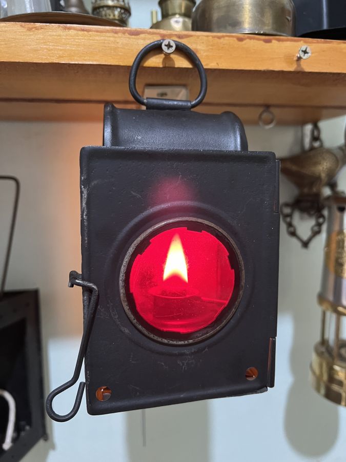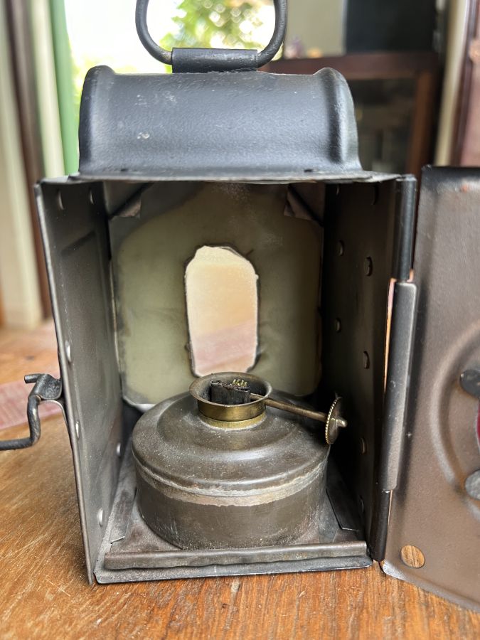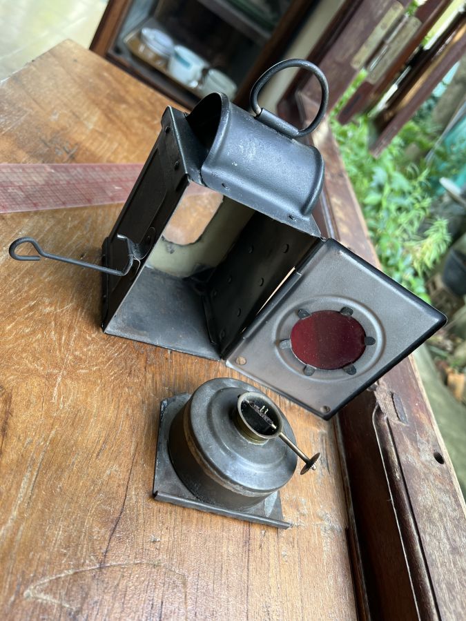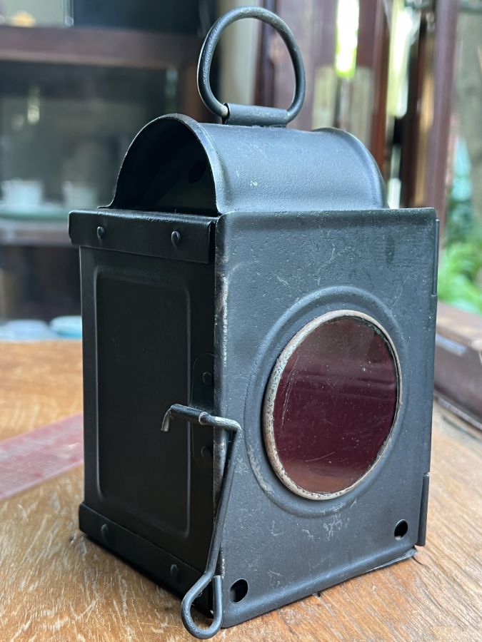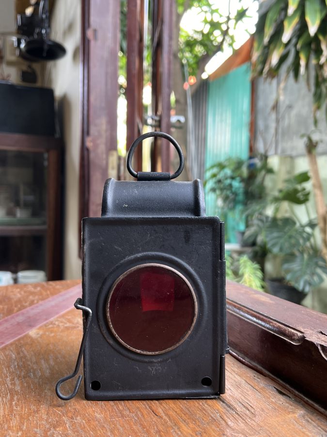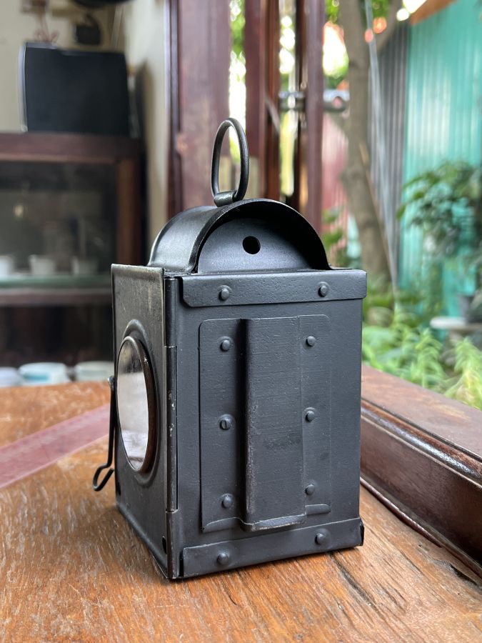 Dòng lantern cổ khung thiếc, bầu dầu thiếc họng đồng. Mặt kính đỏ và một mặt trong