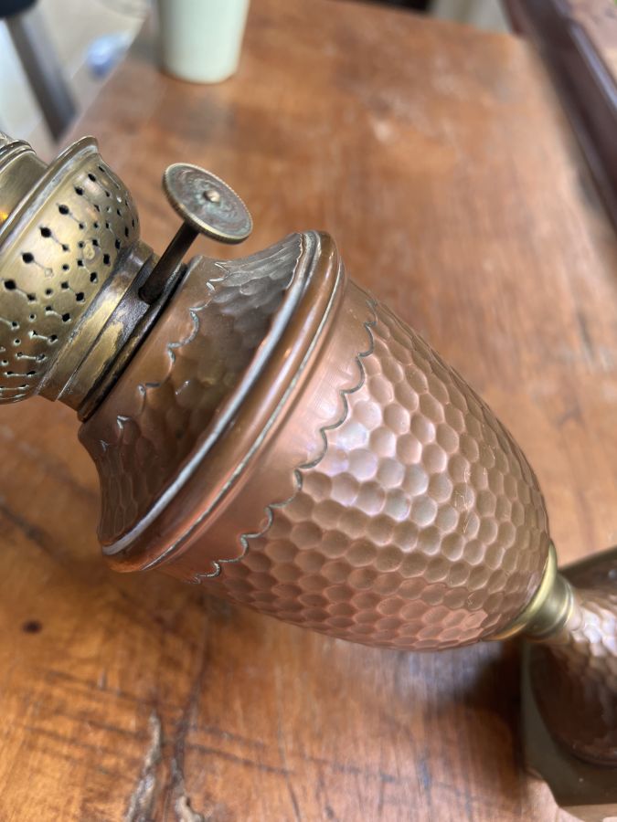 Em giao lưu đèn dầu Pháp cổ, sâu tuổi gò thủ công hoa văn Vết búa kín thân rất đẹp và cầu kỳ.