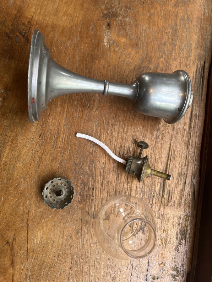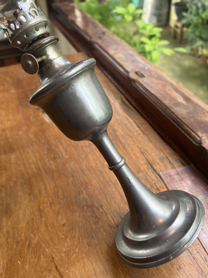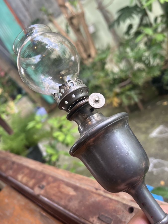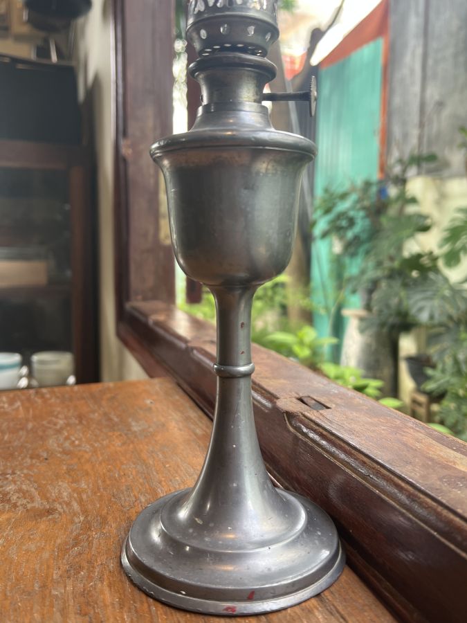 Em giao lưu đèn dầu Pháp cổ = Thiếc đúc dày nặng tay. Mẫu này hiếm gặp hơn mẫu Đồng đúc.