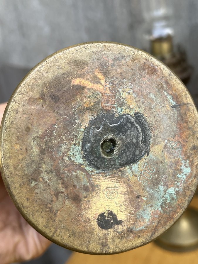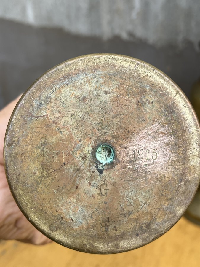 Chất đồng vỏ Pháo dày nặng với ký hiệu ********** dưới đáy SX 1915 cả đôi. Đăng đối đều đẹp ạ.