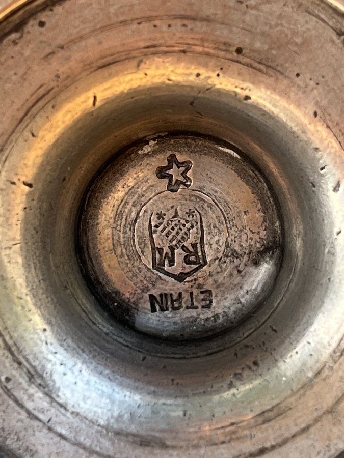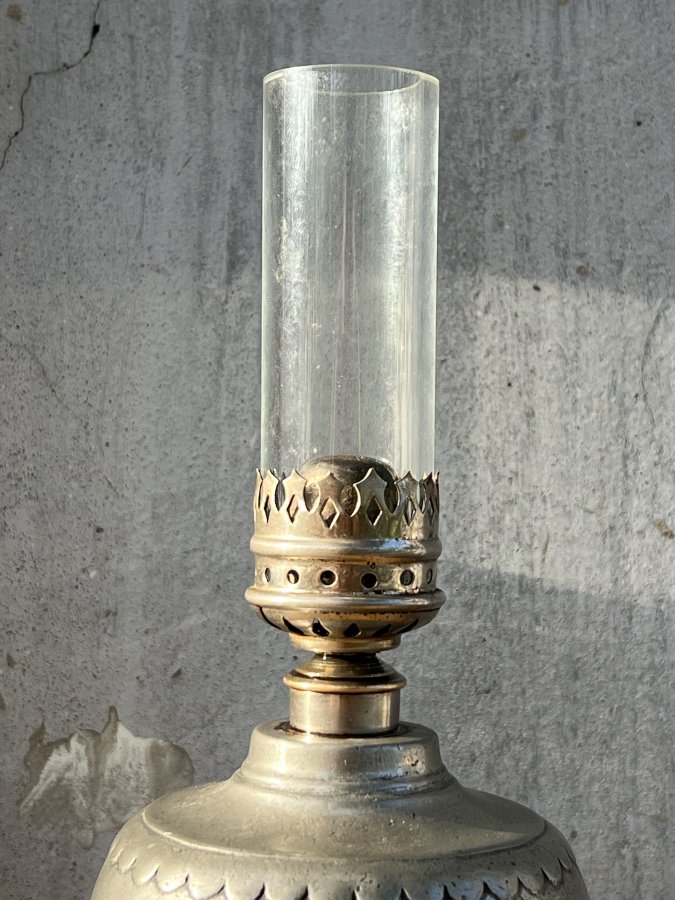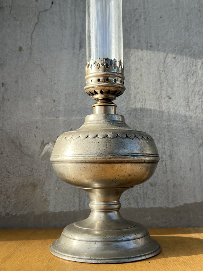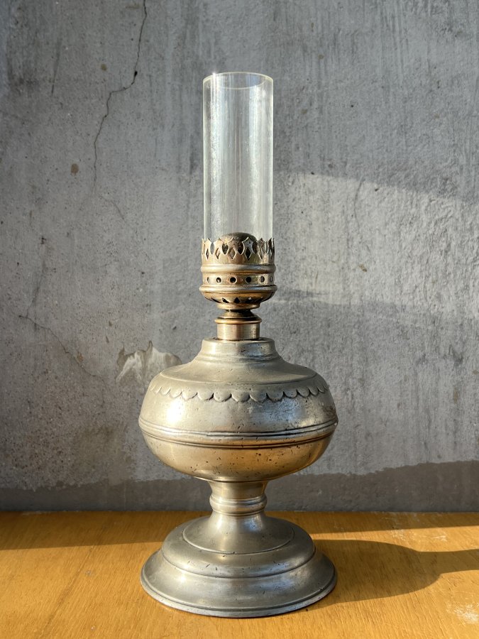 Em giao lưu đèn dầu Pháp cổ, chất thiếc đúc khá dày và nặng, mộc chữ rõ nét dưới đáy đèn, dáng bầu nở eo thon rất đẹp mắt.