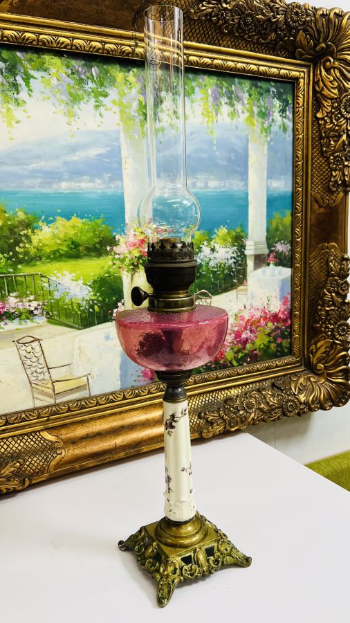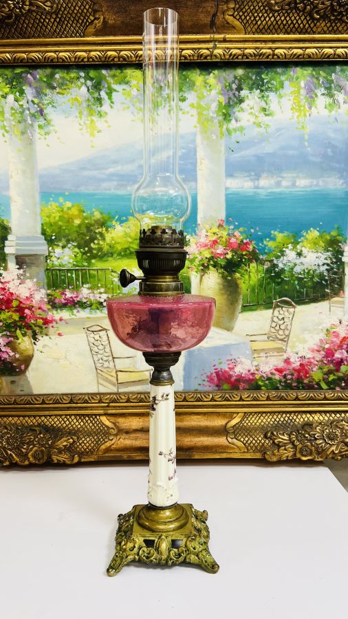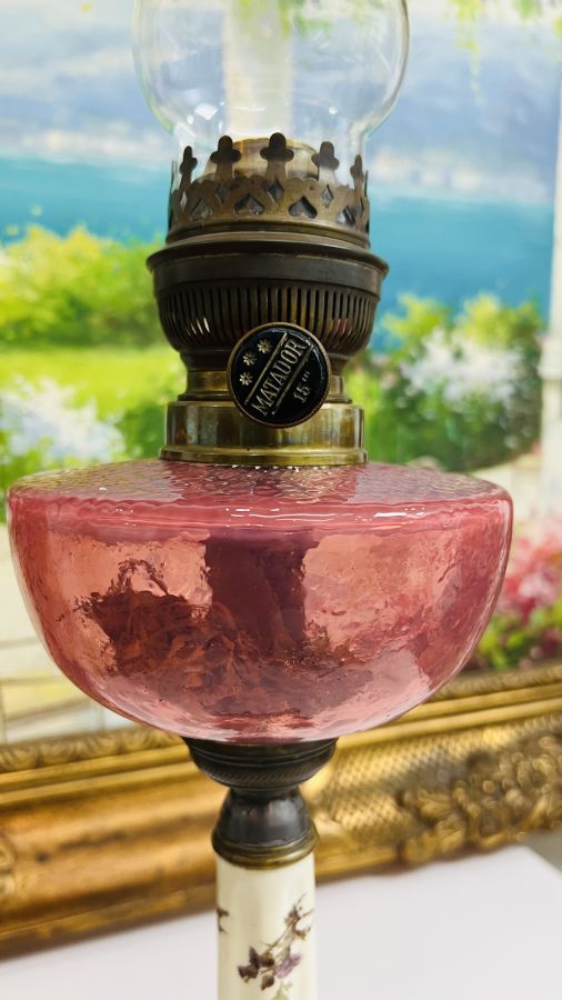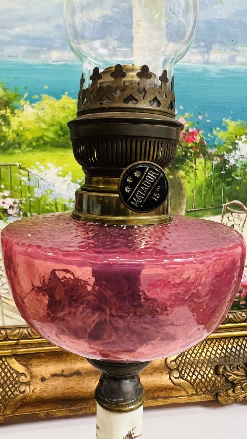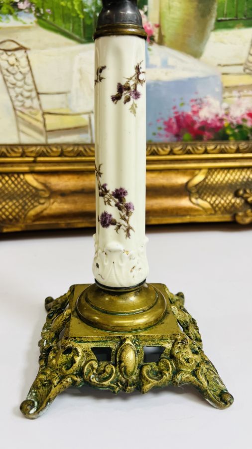 Đèn dầu Pháp chuẩn Cổ bầu pha Lê Hồng Sen rất hiếm chân đồng đúc kết hợp sứ vẽ hoa lá Tây tuyệt đẹp Zin nguyên bản sử dụng tốt