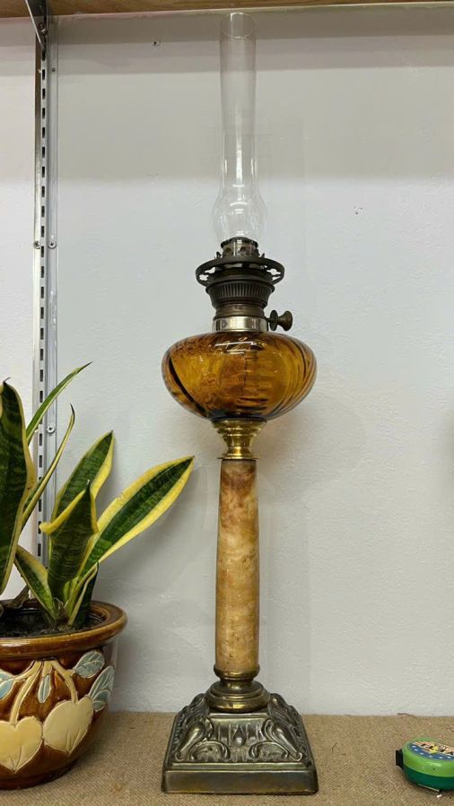 Đèn pháp cổ bầu pha Lê màu ho phách chân đá già đã lên nước