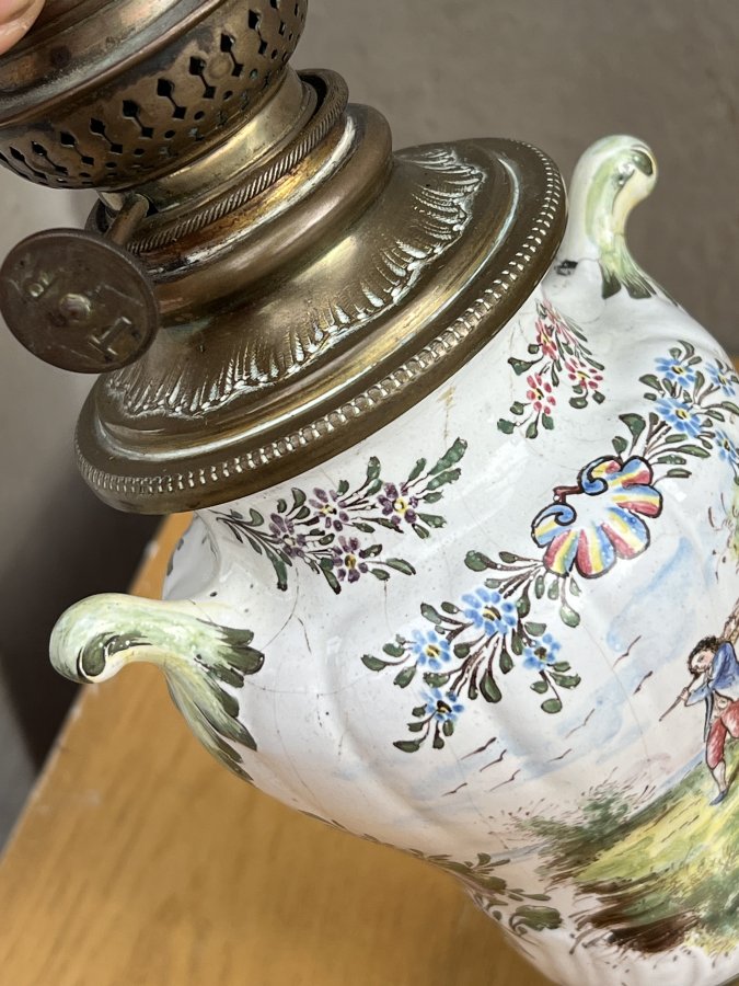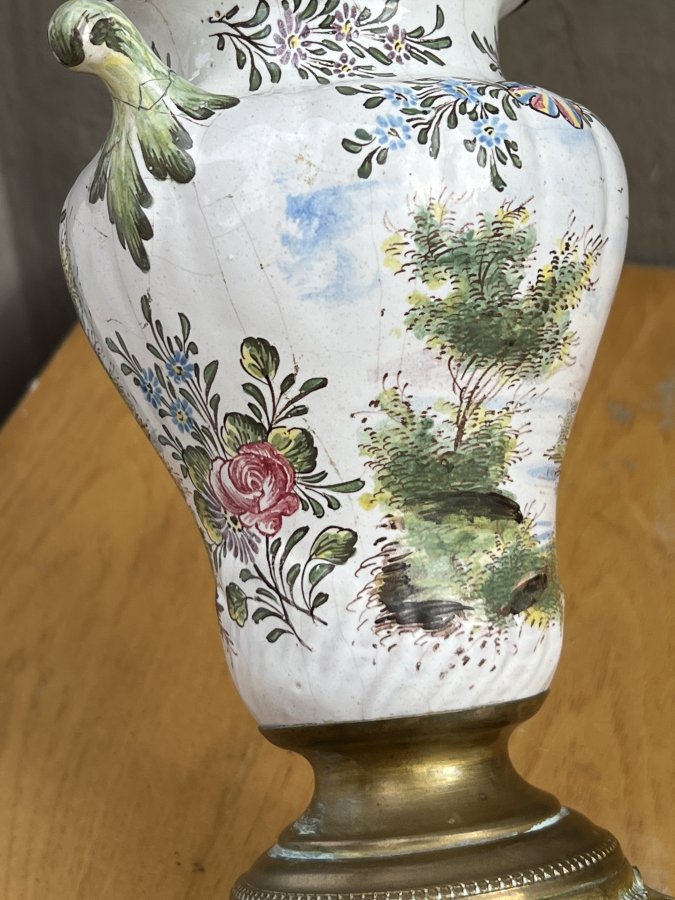 Chân đồng đúc hoạ tiết đẹp với 4 chân chắc chắn. Bầu bằng Đồng bọc gốm men vẽ phong cảnh đồng quê châu âu rất đẹp mắt. Chất gốm lâu ngày nay ra nhiều vết rạn => Men rạn nhìn cũng rất cổ điển và kết cấu vẫn cứng cáp ko nứt bể.