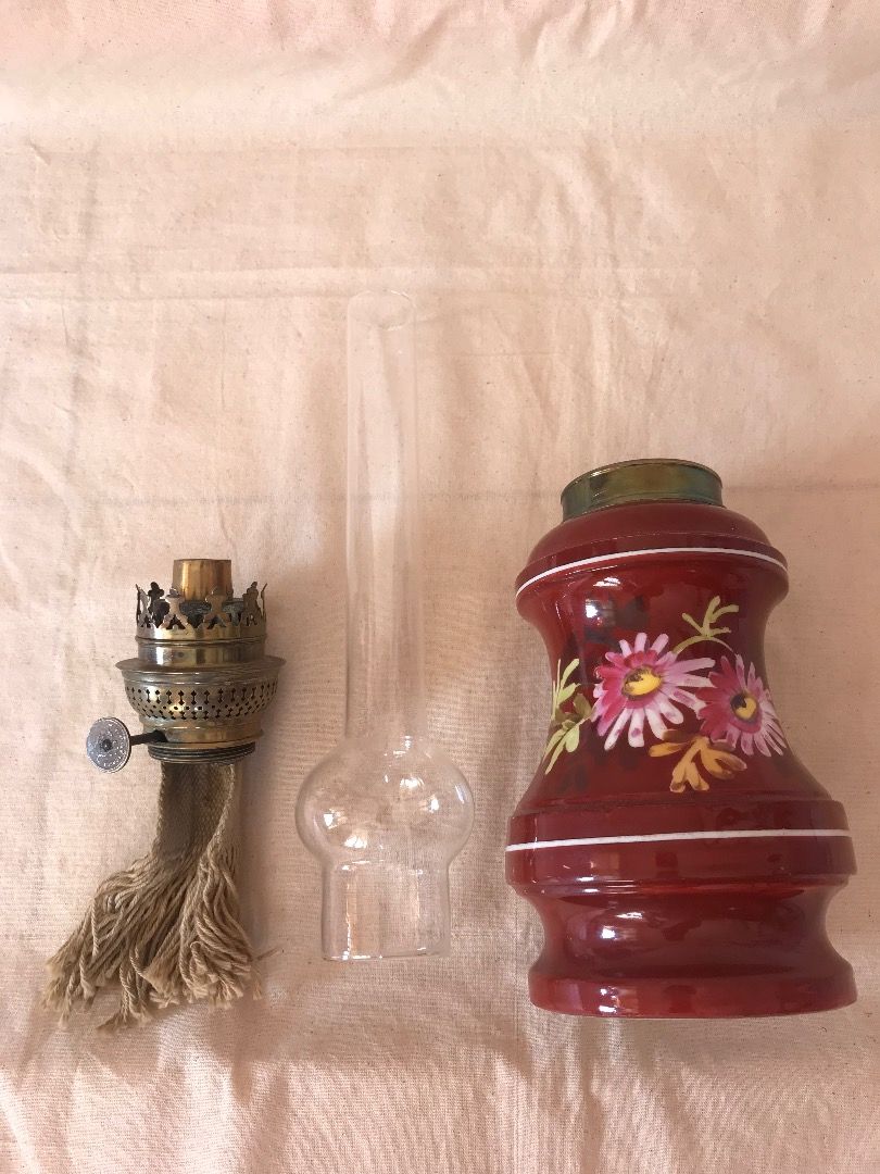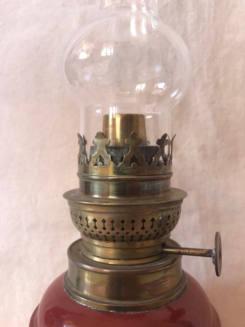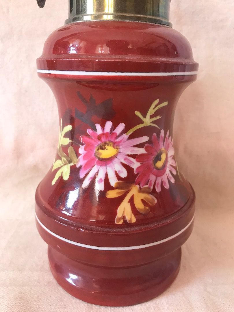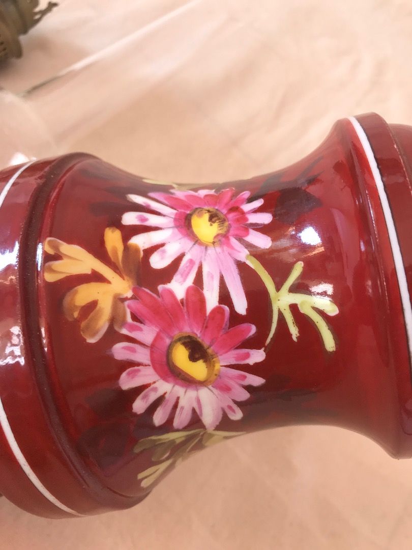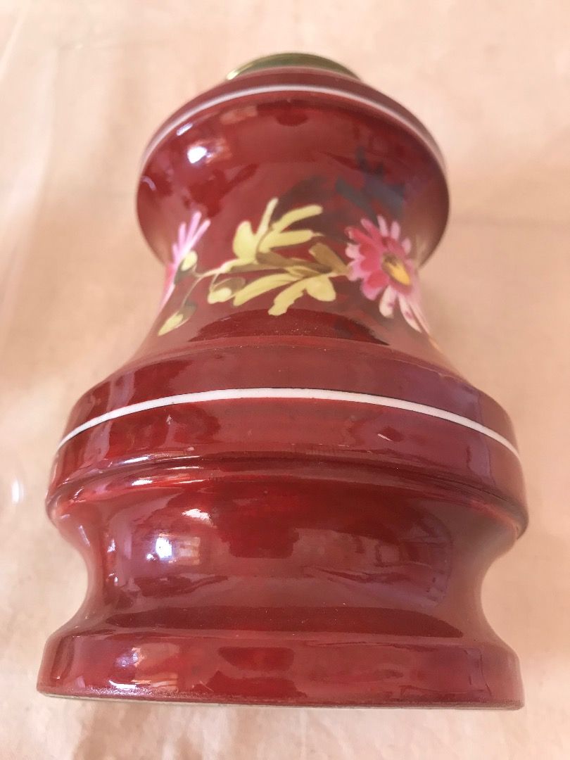 Đèn dầu sứ men hoa văn vẽ Tay của Pháp Màu Đỏ Đô độc đáo sang trọng. Chất sứ khá dày nặng và chắc chắn. Cao tổng thể 48cm cả bóng Lành tít bao đốt luôn. Giá 1500k bao ship Phụng 0934751920