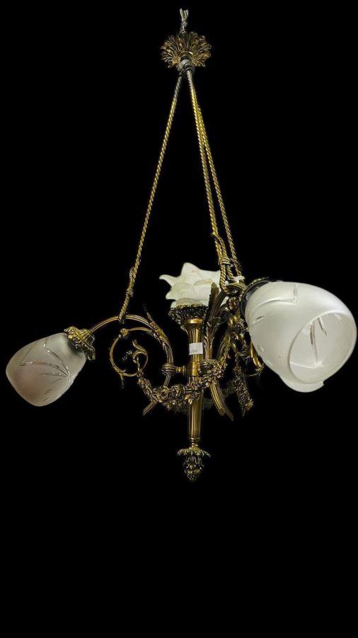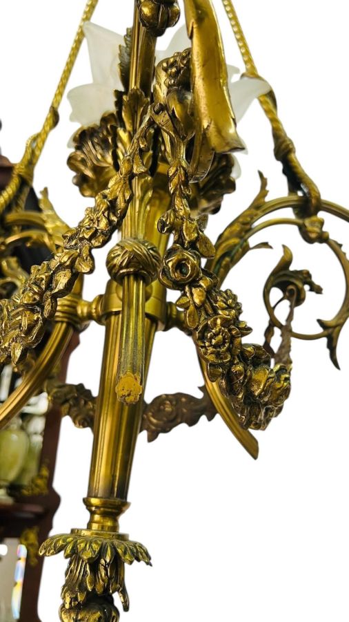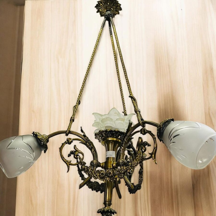 Đèn trần Pháp cổ chuẩn hàng xưa, chất liệu đồng đúc hoa hồng, mạ vàng còn giữ màu rất tốt.