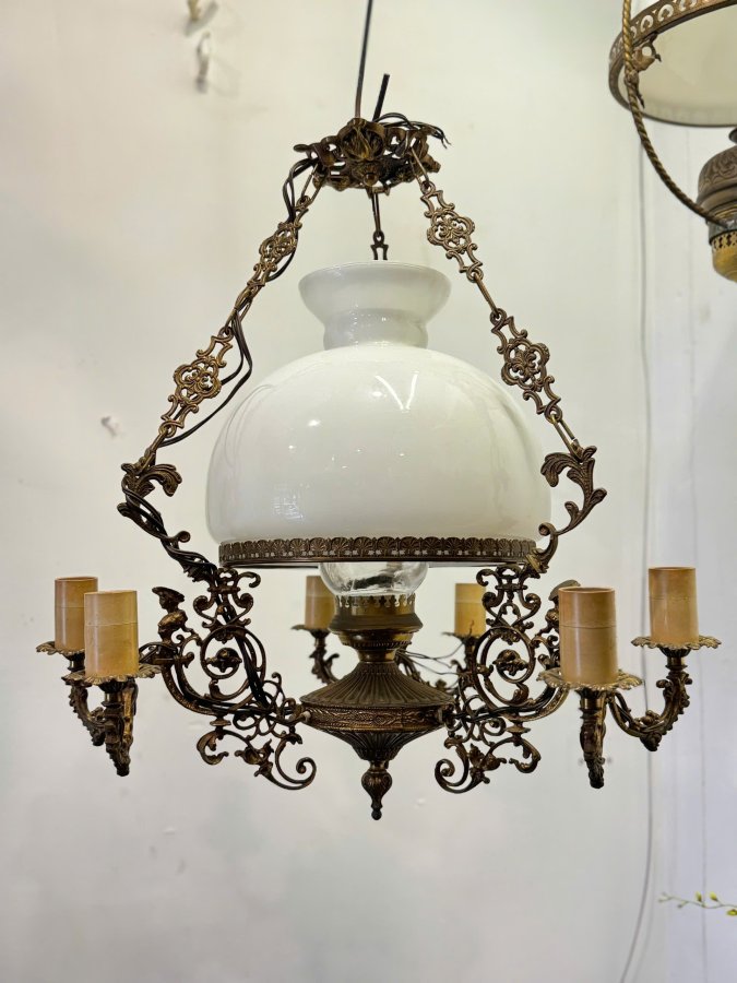 Chất liệu: đồng trạm trổ, chao thủy tinh trắng