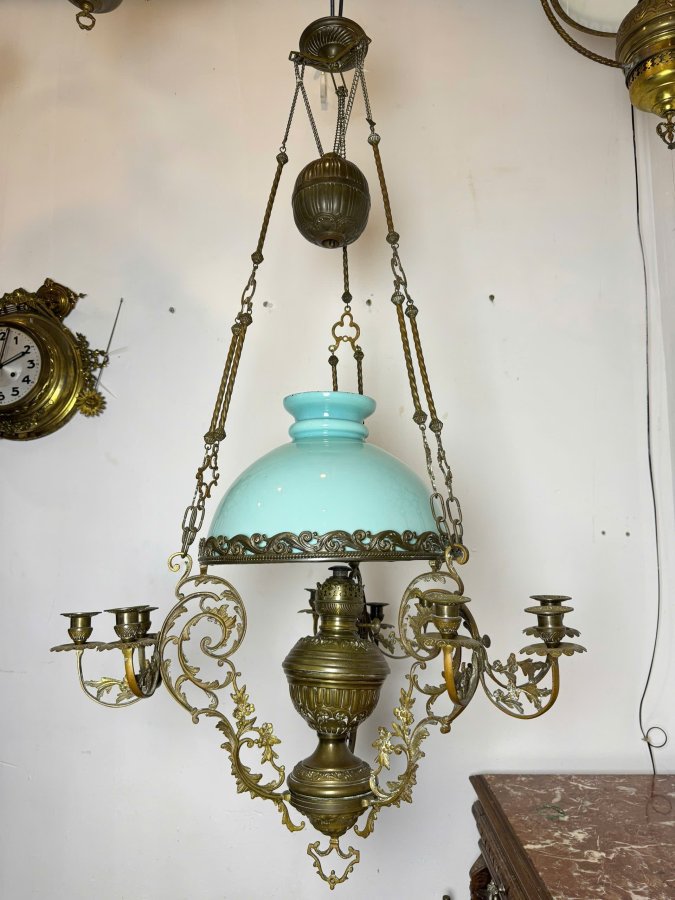 Chất liệu: đồng trạm trổ, chao thủy tinh xanh