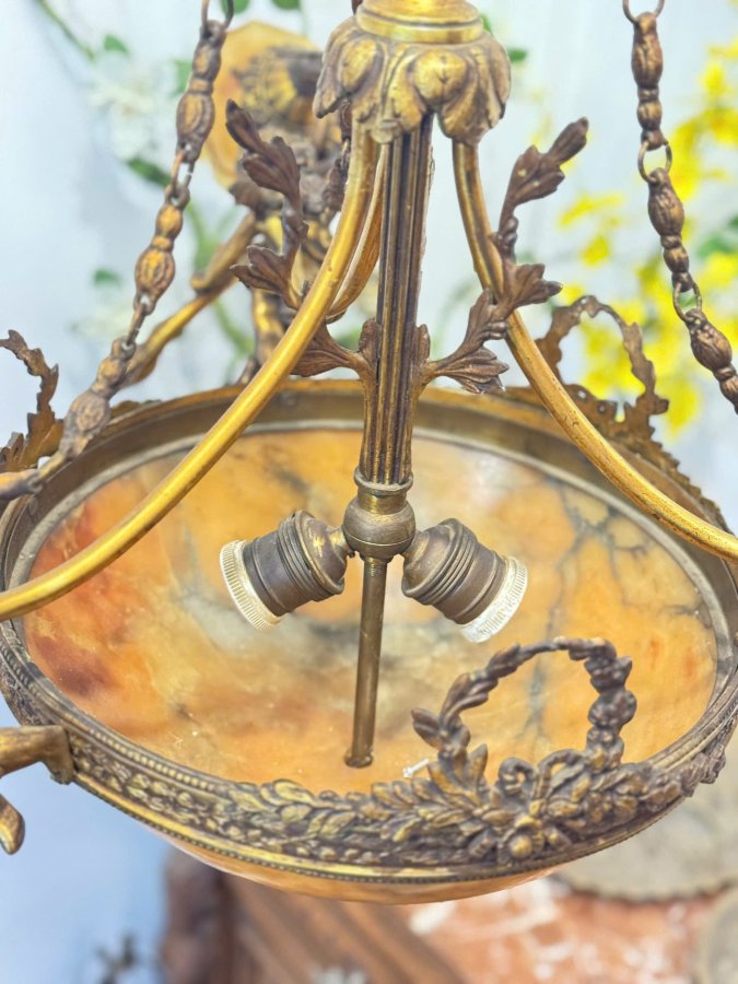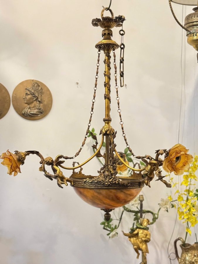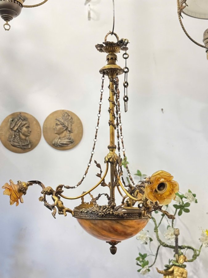 Đèn Treo Trần Chao Đá Hổ Phách Cổ |Tượng Cu Tí Hoa Hồng