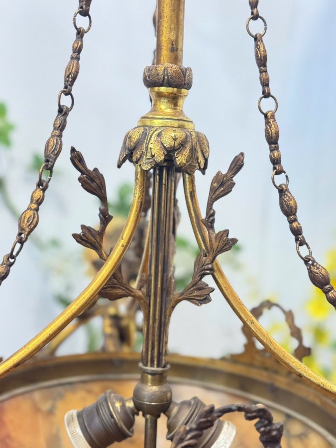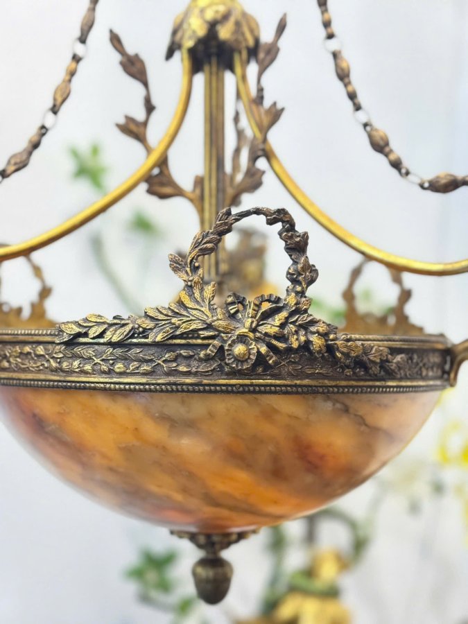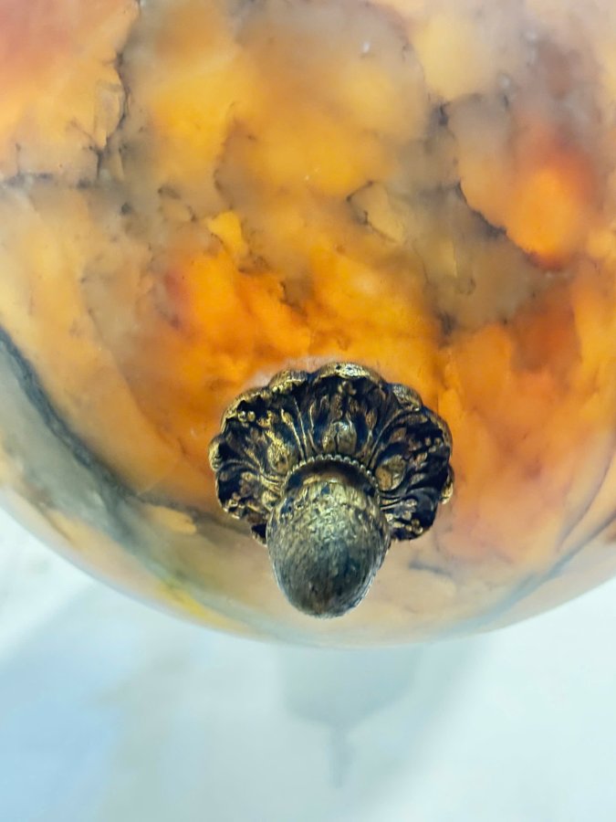 Kích thước: C92 cm, N76 cmChất liệu: đồng, chao đá hổ phách cổ💥 Hoạ tiết chạm khắc cực tinh tế, sống động💥 Chao đá hổ phách cổ hiếm gặp
