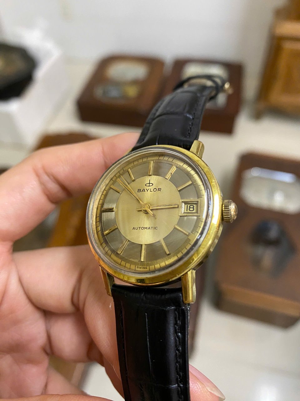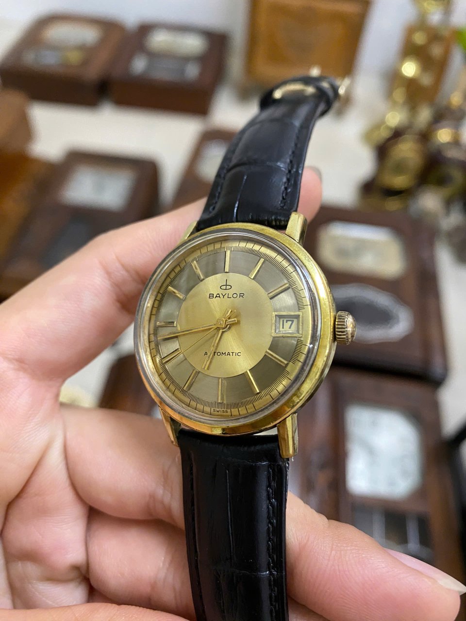 Đeo tay cổ automatic Thụy Sĩ BaylorSize: 33.8mm - 17 jewelsLịch ngày góc 3hVỏ bọc vàng, đáy SSMáy thụy vàng ươmĐang hoạt động.2,5tr