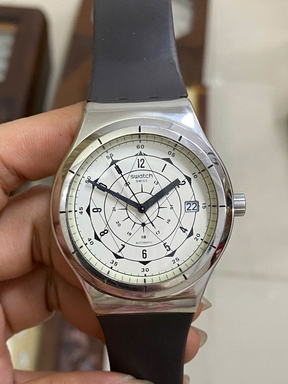 Đeo tay Swatch automatic búa tròn lộ cơ SwissSize lớn: 42mm / Lịch ngày góc 3hAutomatic lộ cơ / 19 JewelsHiện thị đủ số giờ, phút.2,5tr