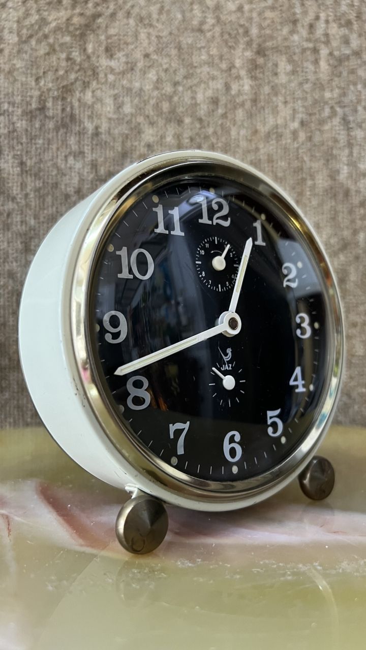 ĐH báo thức JAZ Pháp 4 kim sx 1970 mặt đen tuyệt đẹp như mới, máy hoạt động tốt Cao 12cm