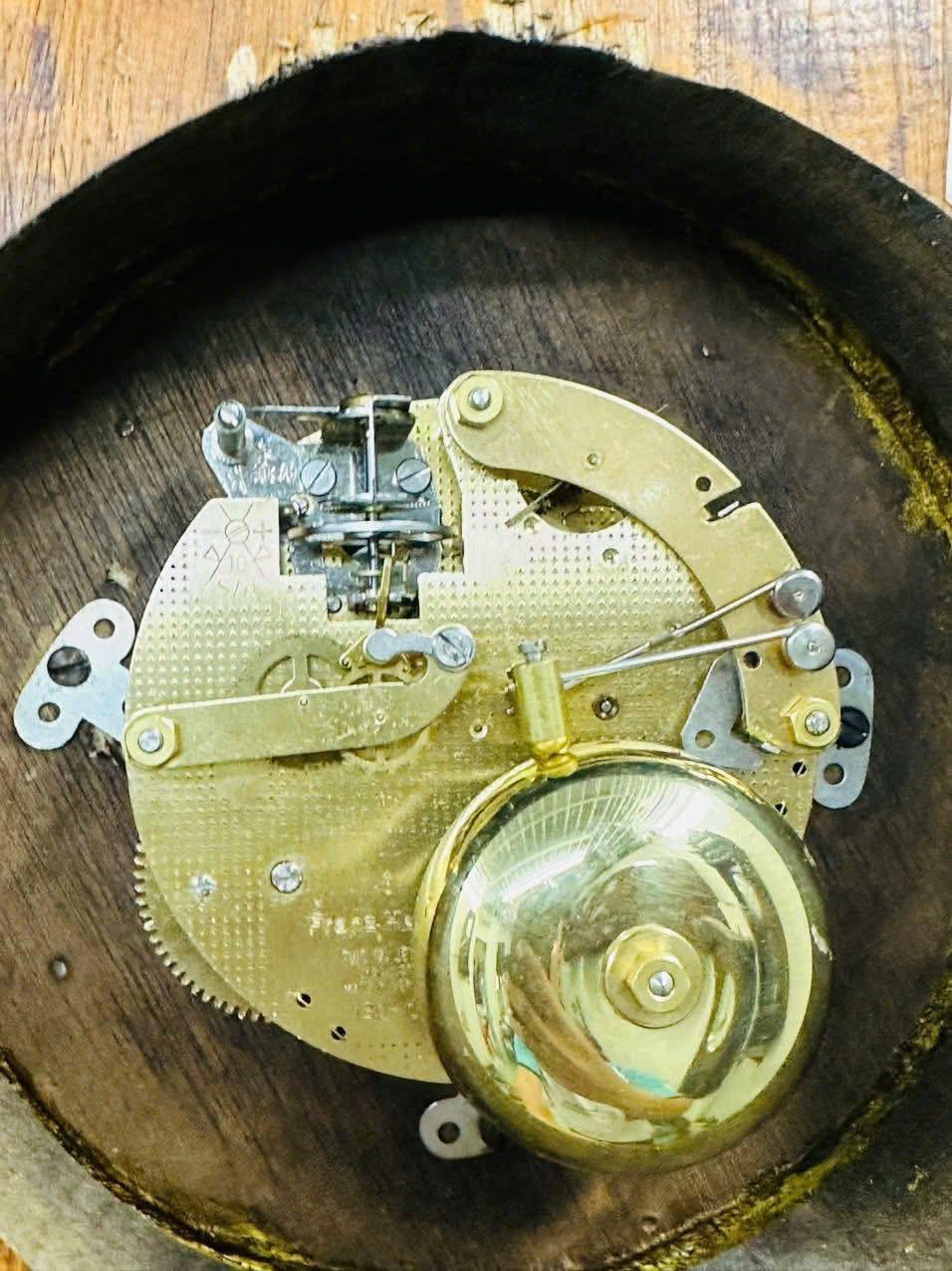 Đồng hồ treo tường gỗ cổ thiếp vàng, tạo hình hoa văn sang trọng. Điểm giờ bằng 2 chuông chén “bing bong” độc đáo, máy móc chạy ổn định.