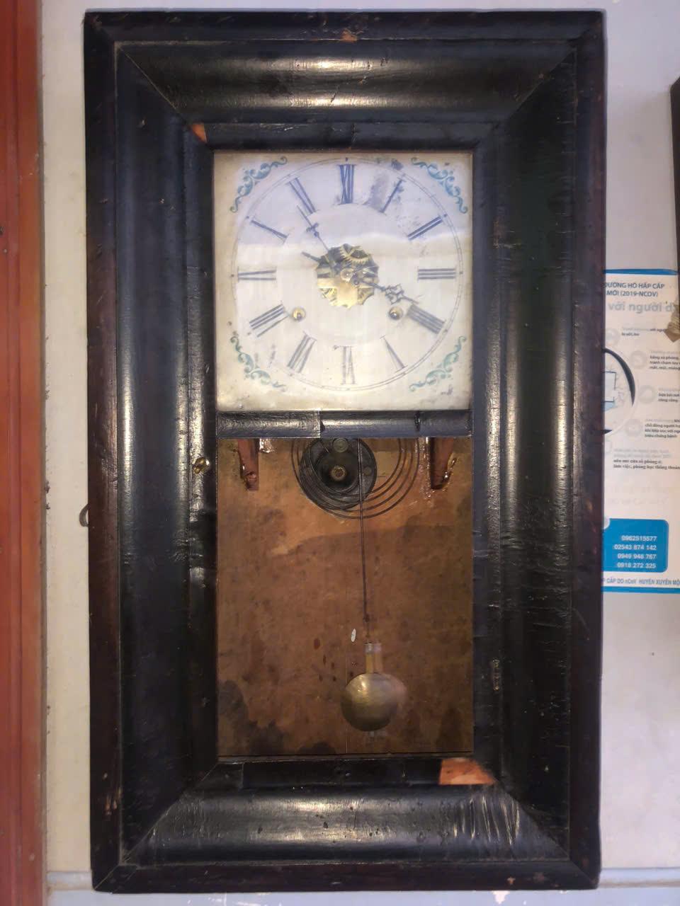 size 68 x 39 cm , cơ chế hoạt động bằng 2 quả tạ đc treo bằng ròng rọc trên đỉnh thùng, thằng tây gọi là thăng bằng và trọng lượng, máy lộ tim thấy đc con ngựa hoạt động rất đẹp mắt và dể cân chỉnh, chuông 60 phút bằng gong vòng ngân nga, cùng với seth thomas là biểu tượng của nước Mỹ làm phá sản hàng loạt thương hiệu lớn của châu âu, đh hơn 160 tuổi hoạt động hoàn hảo đáng sưu tầm