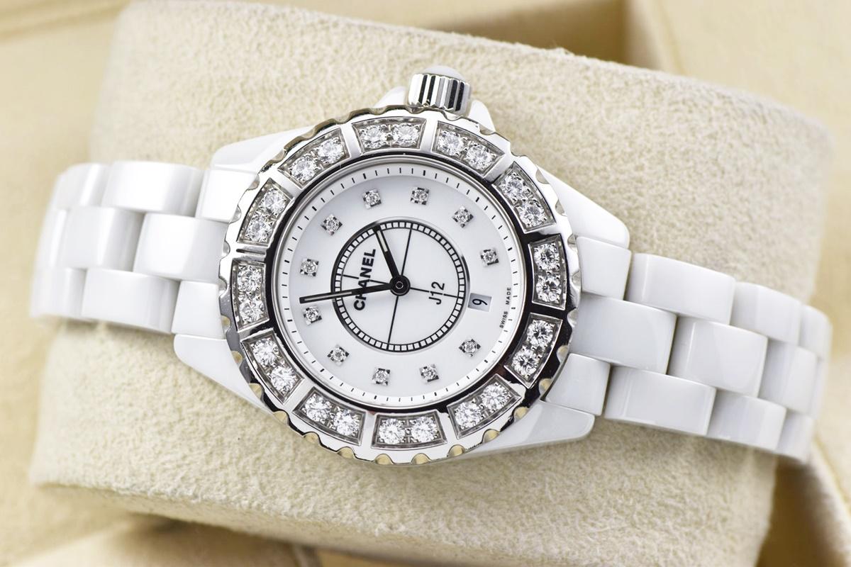 Đồng Hồ Nữ Chanel J12 Niềng & cọc số đính Full Kim Cương - Đá Ceramic trắng - Size 33mm - Fullbox...