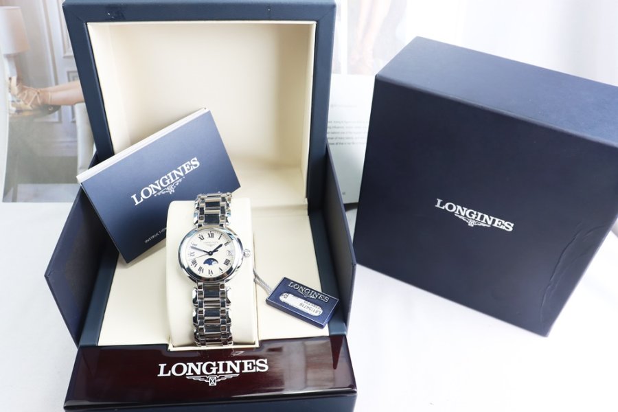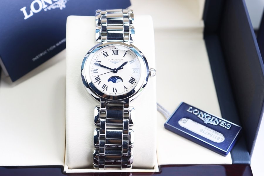 Đồng Hồ Nữ : Longines Primaluna Moonphase, Kim Nung Xanh, cọc số giờ La Mã, Fullbox.