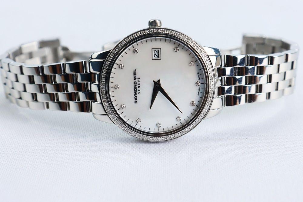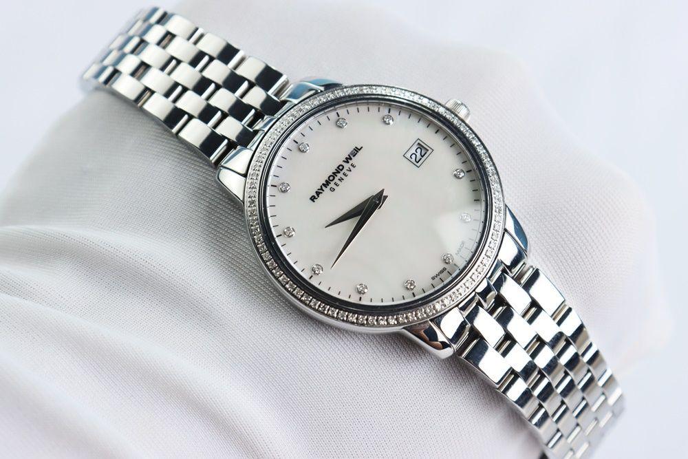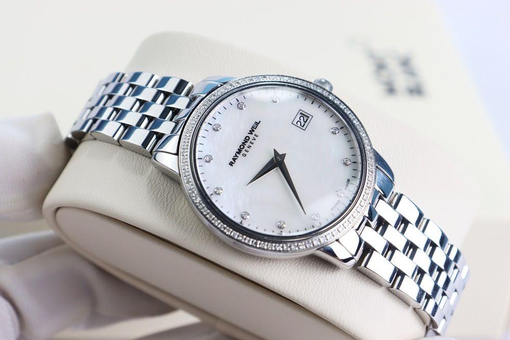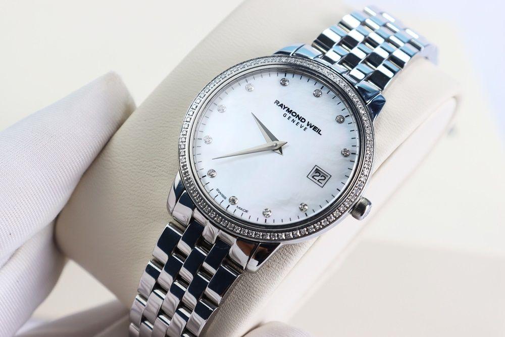 Đồng Hồ Nữ : Raymond Weil Mặt xà cừ, Niềng & cọc số đính full Kim Cương Fullbox....
