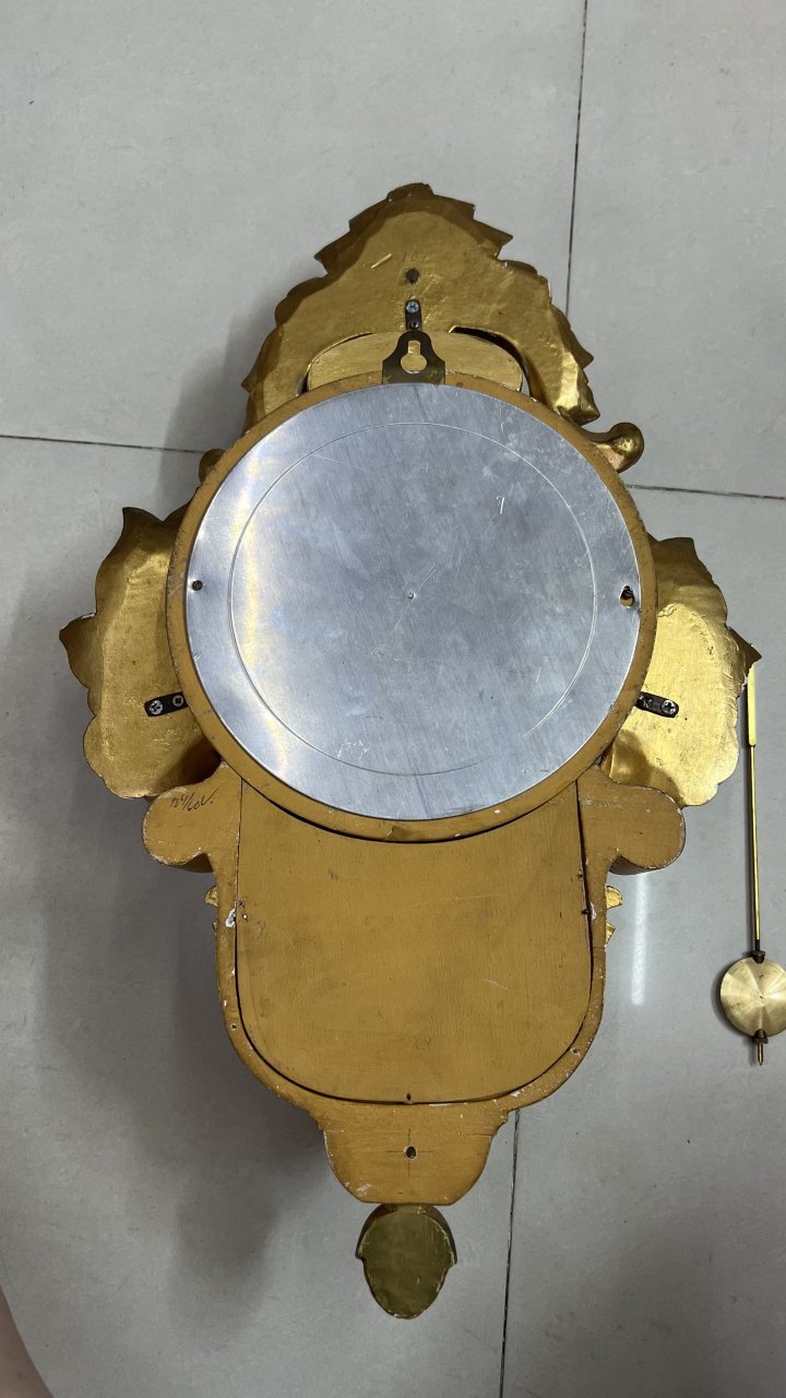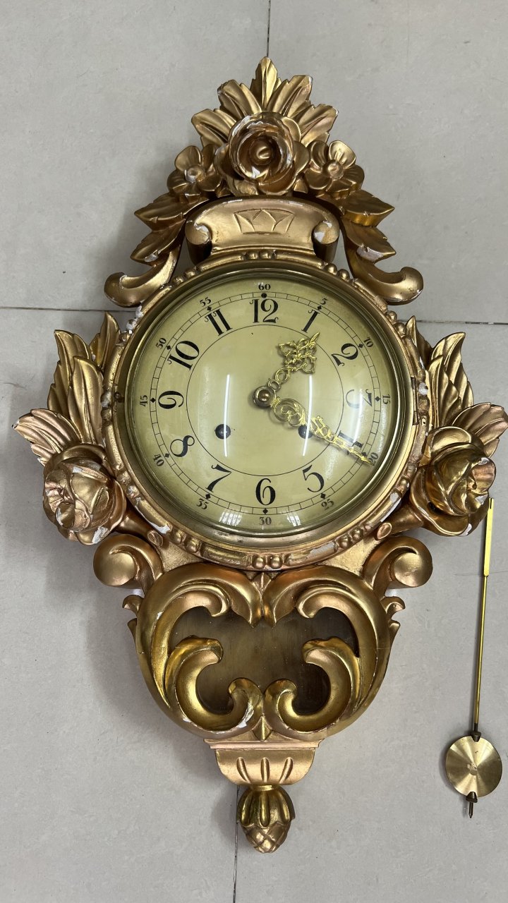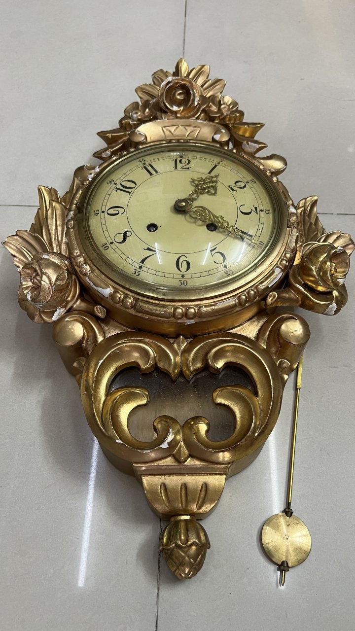 phù điêu gỗ Thuỵ Điễn thiếp vàng size rất to 2 lổ đánh chuông chén âm thanh rất hay, máy vàng đẹp như mới, đang chạyCao 60cm, ngang 37cm, mặt số 19,5cm, kính mo cong.
