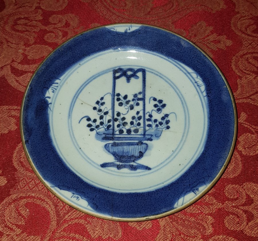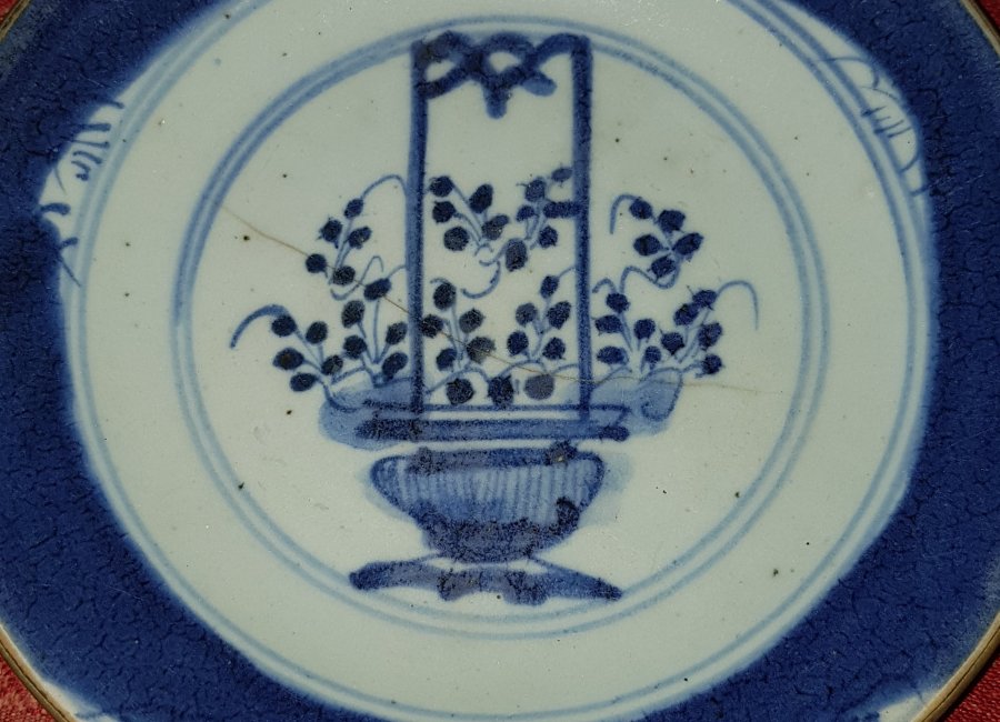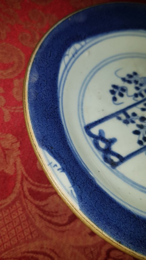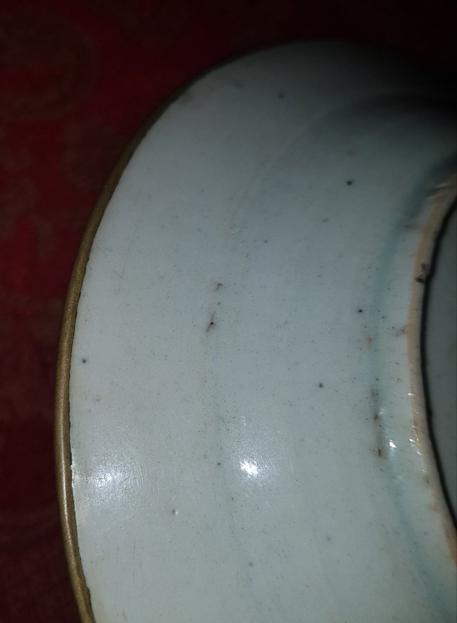 Đĩa chuẩn cổ thời Khang Hy cốt sứ mỏng men lam chàm hồi nhìn rõ nét. được nghệ nhân xưa bọc đồng viền miệng như hình. Tình trạng âm tóc rõ rệt qua hình chụp. GL950k