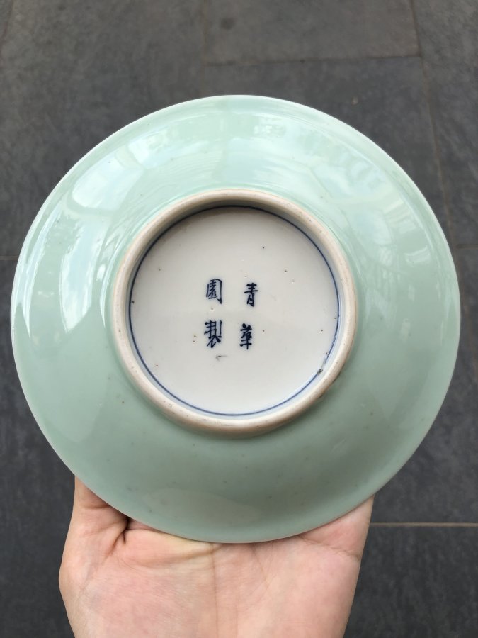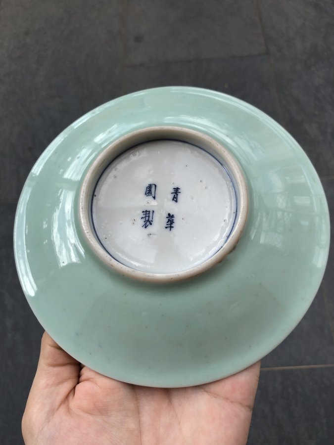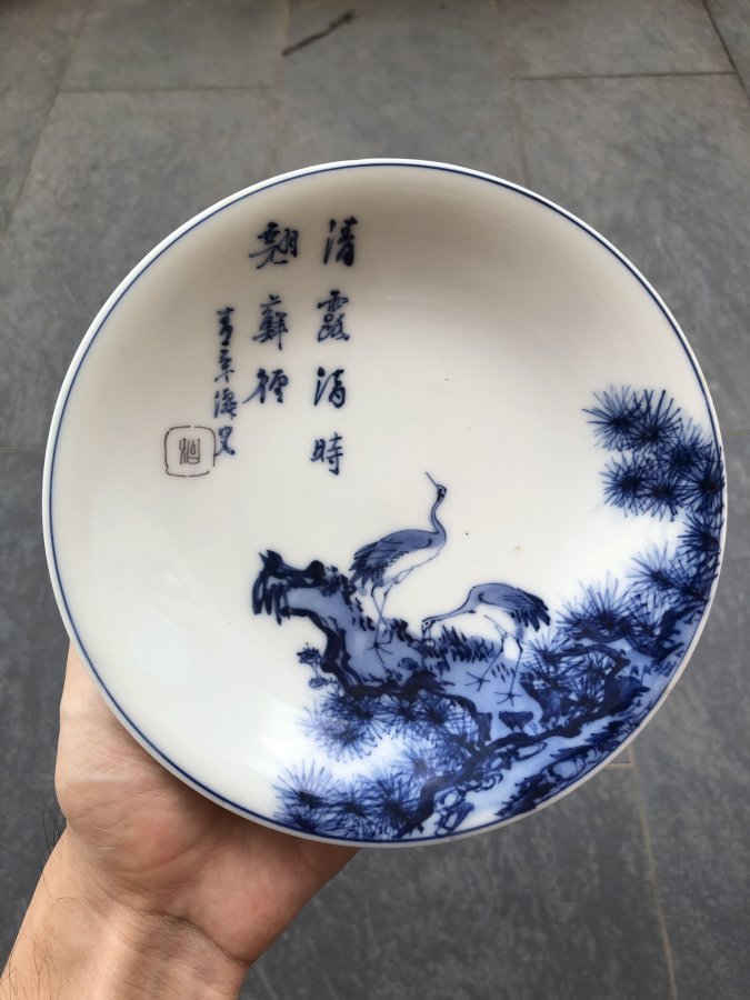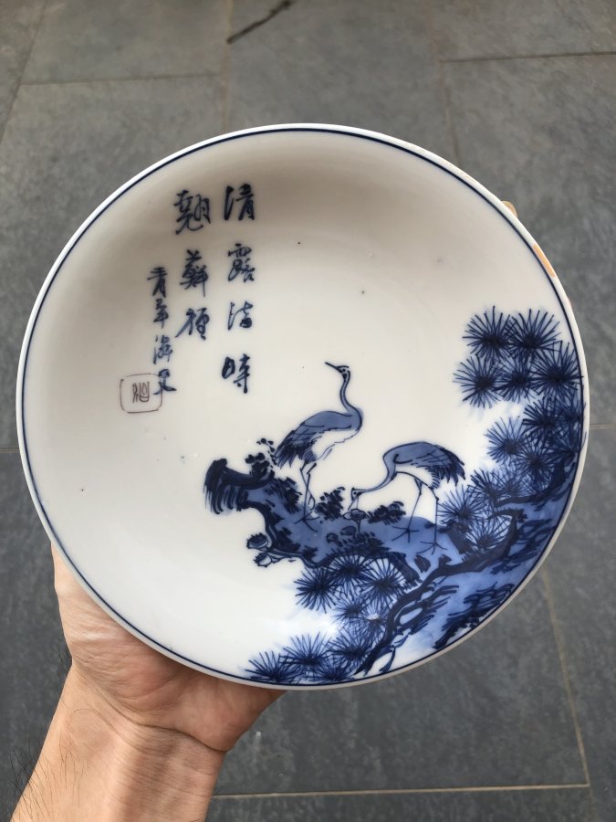 Chiếc dĩa cổ đông thanh vẽ seto lam rất đẹp, tích tùng hạc viết thư pháp hiếm thấy, có mộc đỏ và triện đáy rất xứng đáng để sưu tầm