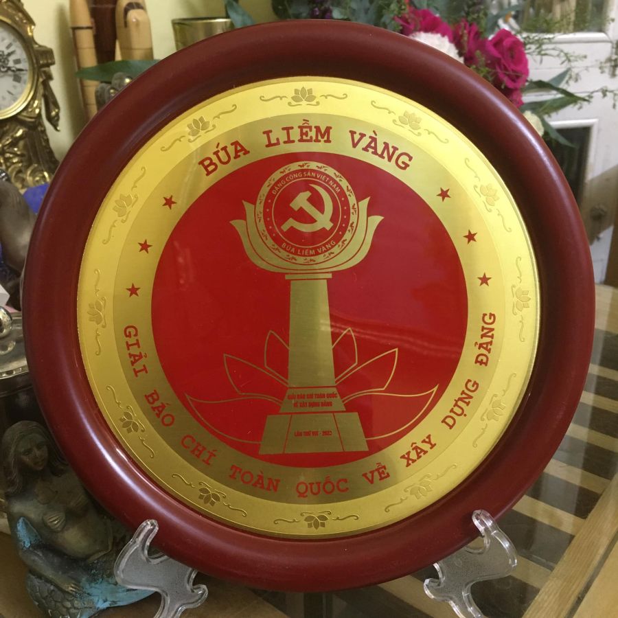 Đĩa đồng Giải búa liềm vàng - Giải báo chí toàn quốc về xây dựng Đảng lần thứ VIII năm 2023, cực hiếm cho anh em sưu tầm*********, chất liệu đồng vàng phủ thủy tinh hữu cơ***, mới 100%, ***có giá nhựa, kích thước đk 23 cm. Giá bán : 500 k + ship, nhận ship toàn quốc.