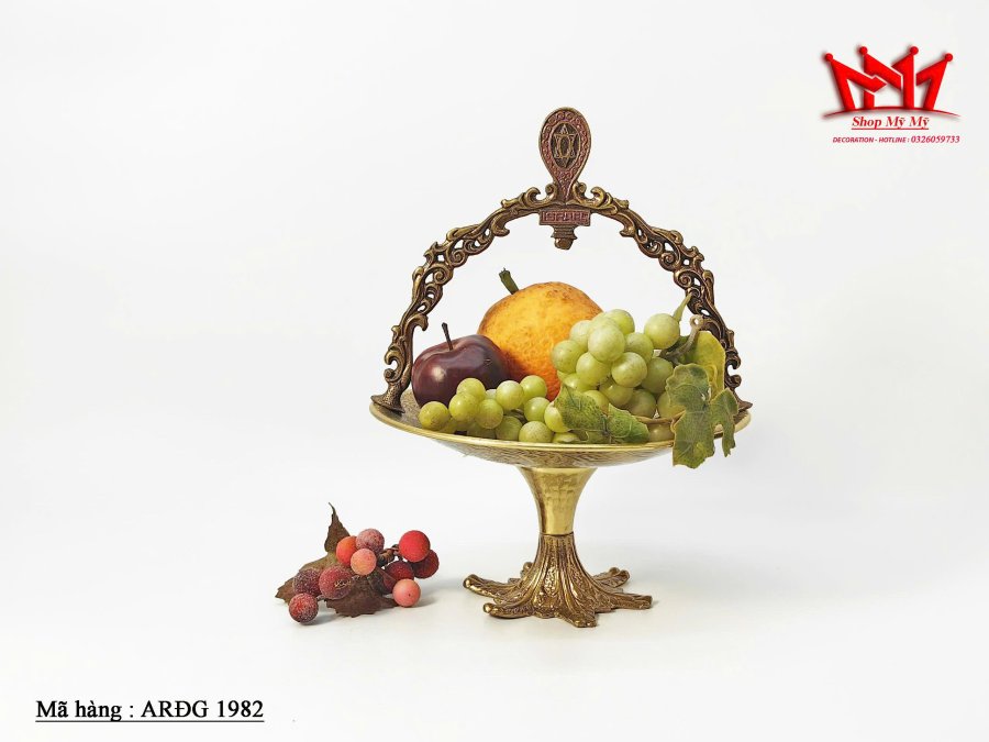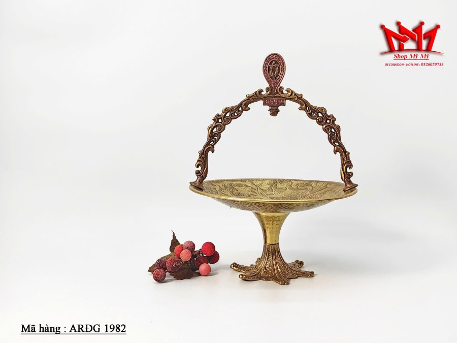 Đĩa đựng trái cây bằng đồng có chân đế cao và quai sách