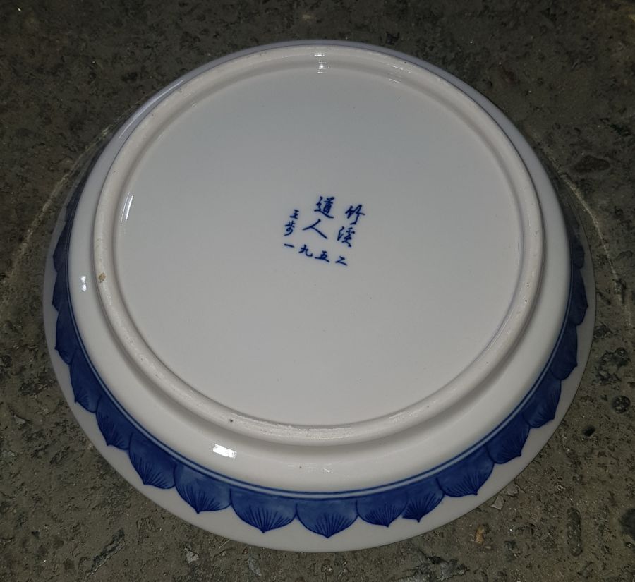 Đĩa sâu lòng hiệu đề 1952 niên với họa pháp chim hoa có đề thơ và men chàm h.uyết đ.ỉa. Đĩa đường kính 19.5cm. cao 5cm. lành lặn. GL1250k