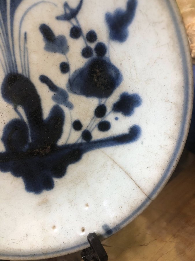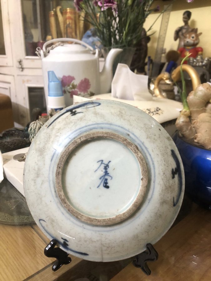 Đĩa sứ cổ Đại Thanh hình hoa lan sau có chữ Hán ***