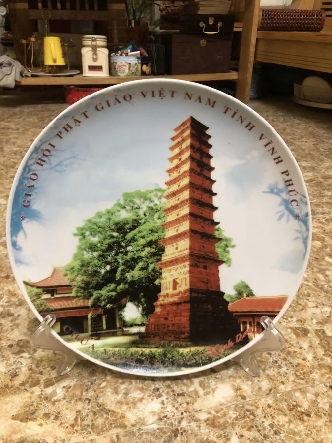 Đĩa sứ đại Tháp Bình Sơn, Sông Lô, Vĩnh Phúc, là ngọn tháp còn lại thời Trần, một trong những kiến trúc tiêu biểu thời Lý - Trần, công trình đc xếp hạng di tích lịch sử QG cấp đặc biệt, rất hiếm gặp khi sưu tầm, kích thước đk 27 cm, tặng chân nhựa. Giá bán : 270 k + ship, nhận ship toàn quốc.