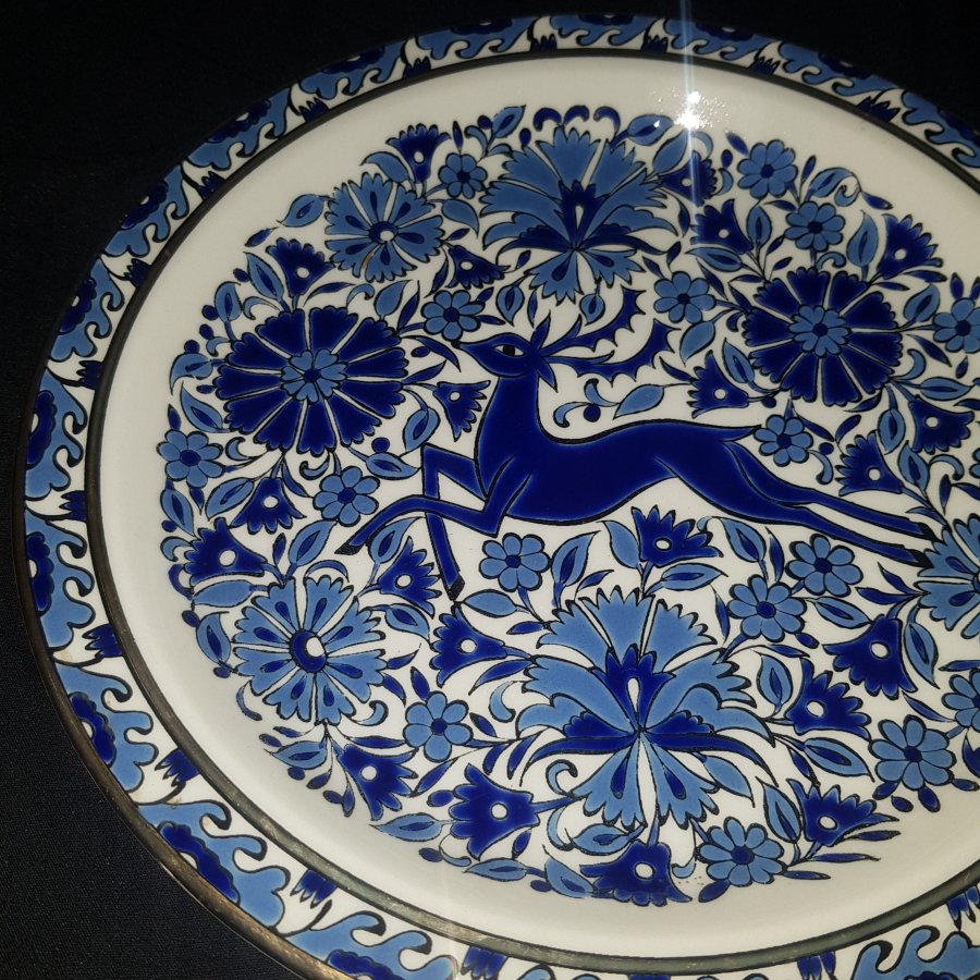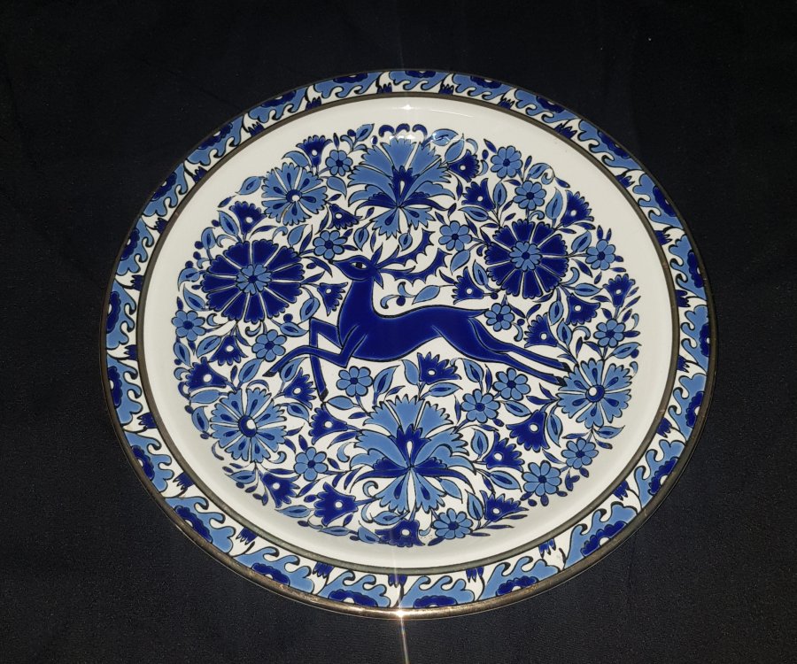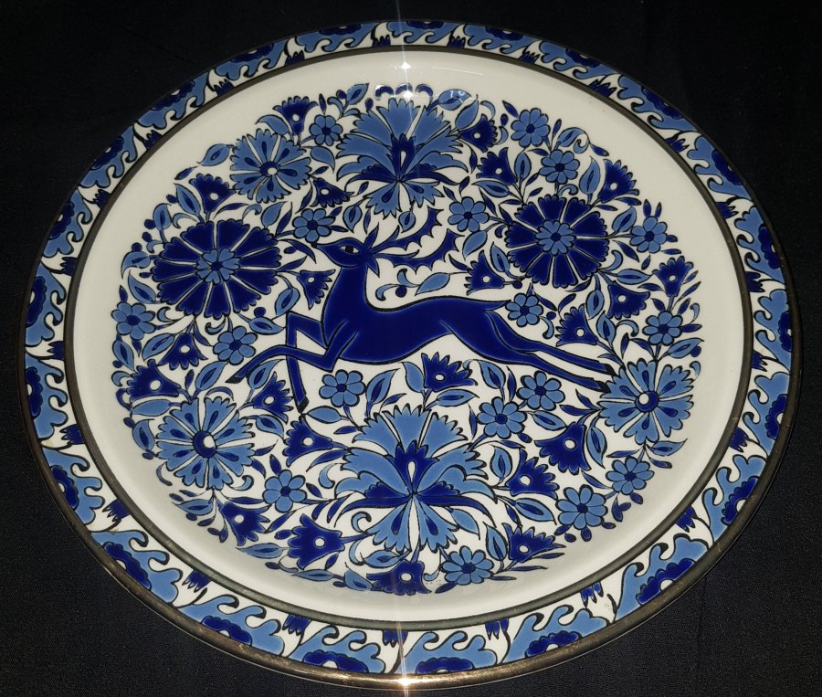 Đĩa sứ của Hy Lạp xưa khắc nổi Tuần Lộc , vành trong ngoài dát vàng. Đĩa lành nguyên. Đường kính 25.5cm. GL550k