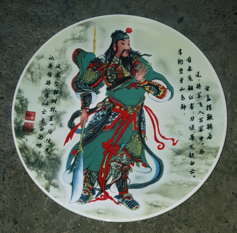 Đĩa sứ Quan Công và thư pháp nói về sự nhân nghĩa của ông được người đời sau ca tụng và phụng thờ. đĩa có đường kính 35.5cm. lành lặn cốt nặng. GL950k