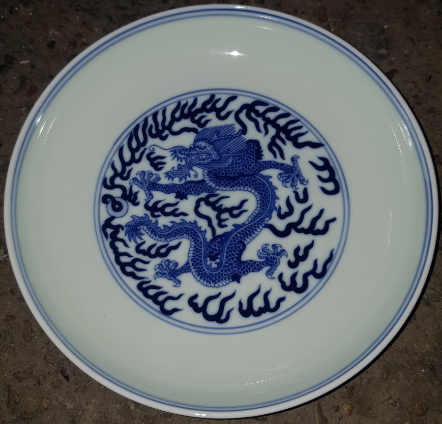 Đĩa sưa vẽ rồng trong ngoài men lam chàm hồi với nét vẽ vương quyền uy dũng tạo nên vẻ đẹp hoàng gia lưu danh. Đĩa có đường kính 17.5cm. cao 3.5cm. Lành lặn . GL1650k