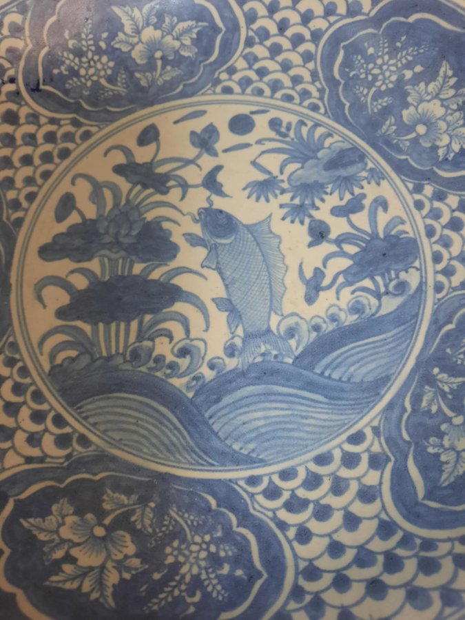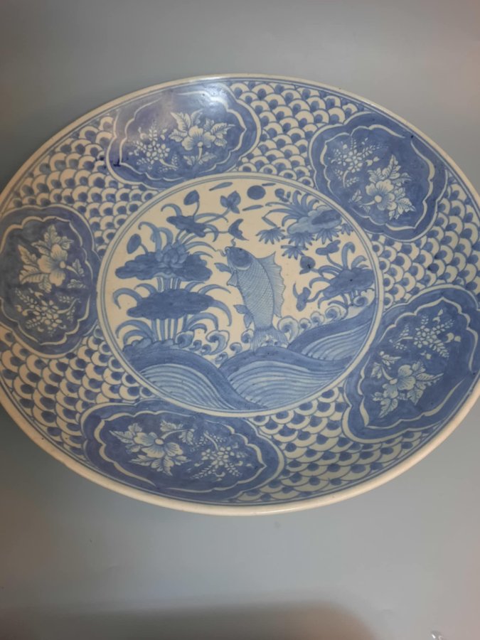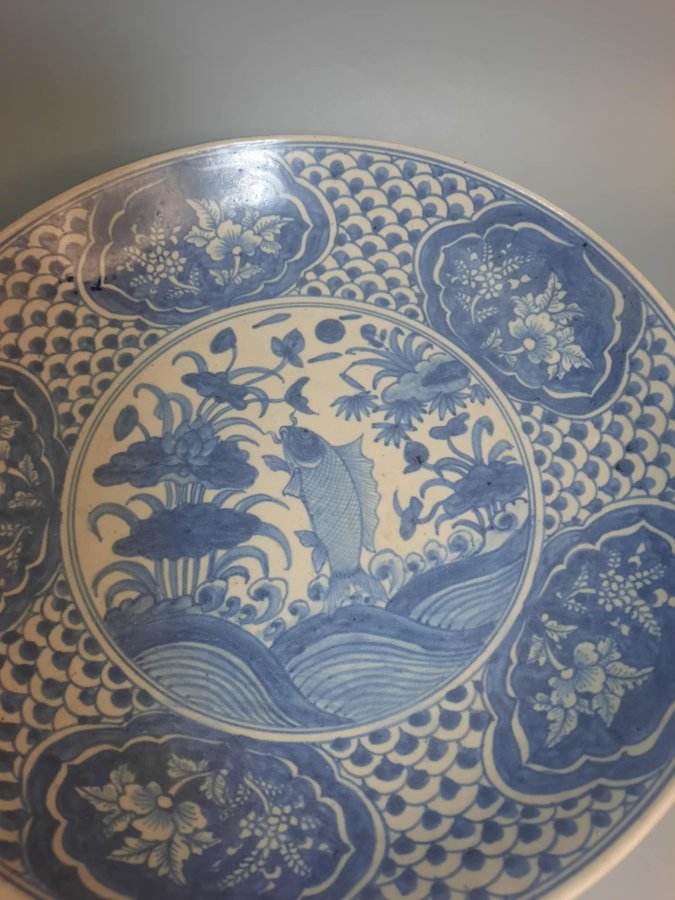 Dĩa Swatow vẽ cá chép vượt vũ môn, đk 38cm, lành, chôn có hỏa biến sa châu