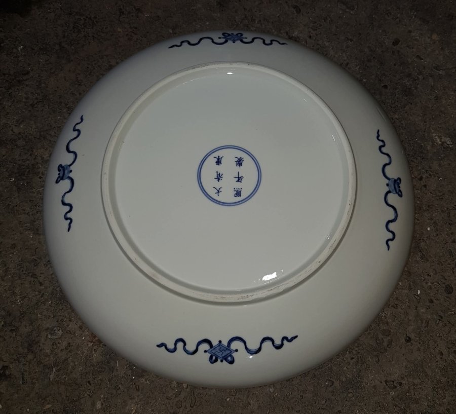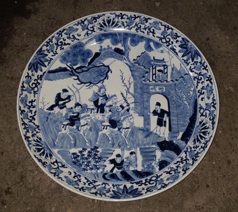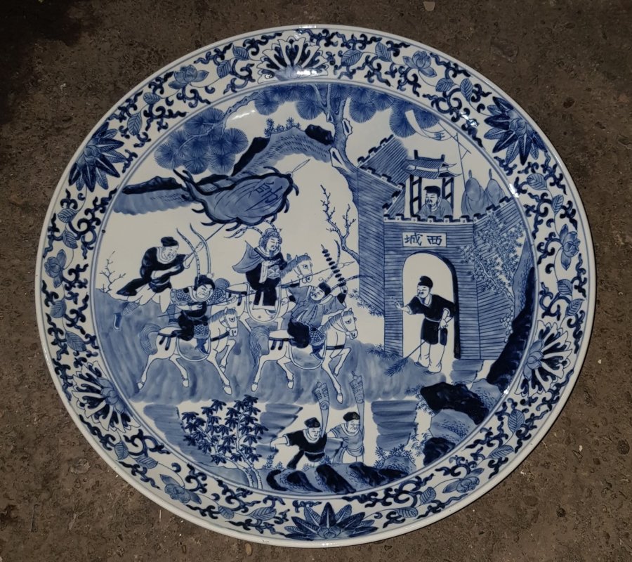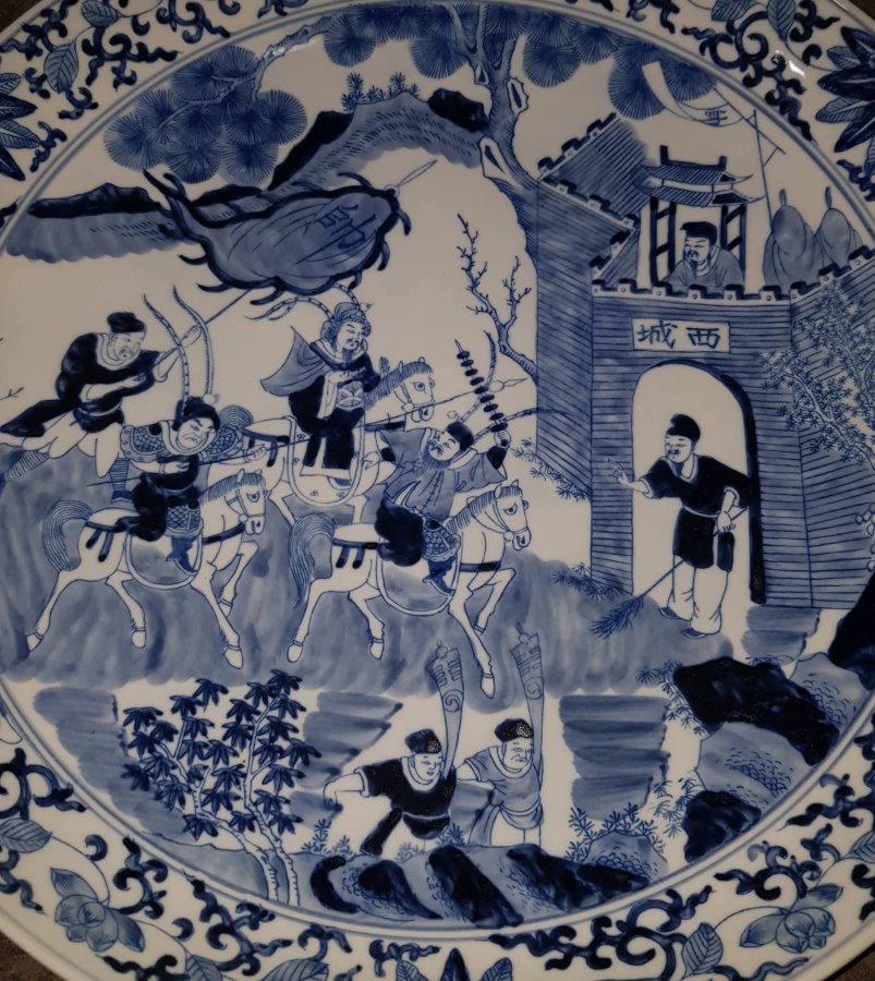 Đĩa sứ kích thước lớn điển tích Tam Quốc trường đoạn " Không Thành Kế " Một mình Khổng Minh Gia Cát Lượng với thành trống đã dùng tiếng đàn trí tuệ cất lên âm thanh xua tan bá vạn hùng binh của Tư Mã Ý. Đĩa kích thước 43.5cm. rất nặng lành lặn.GL1950k