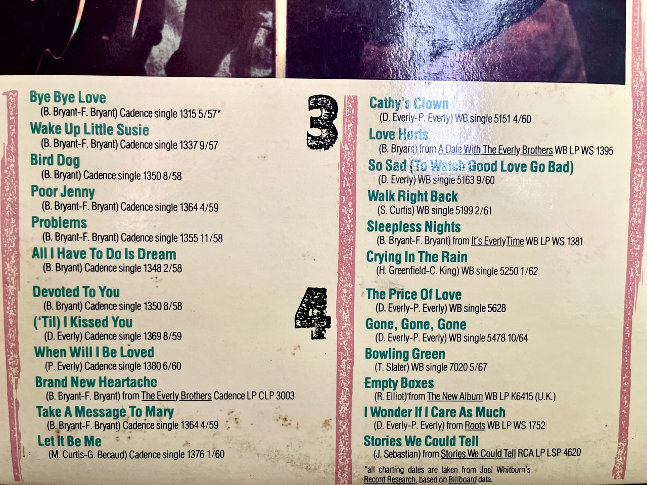• The Everly Brothers là một trong những ban nhạc song ca huyền thoại của làng nhạc Mỹ, với hơn 30 bản hit lọt vào Billboard Hot 100 ,được lập bởi Don Everly và Phil Everly, với giọng ca trong trẻo, hòa quyện mượt mà trở thành dấu ấn, khiến họ khác biệt giữa hàng loạt nhóm rock thời kỳ đầu, những ca khúc đầu tiên như: ALL I HAVE TO DO IS DREAM , BYE BYE LOVE , WAKE UP LITTLE SUSIE đều trở thành hit đạt được sự thành công to lớn, được nhiều người nghe yêu thích, một bộ album cô đọng với 2 đĩa gói gọn tất cả những ca khúc danh giá nhất của nhóm, chuẩn sưu tầm, xin mời cả nhà tham khảo ạ !!!!